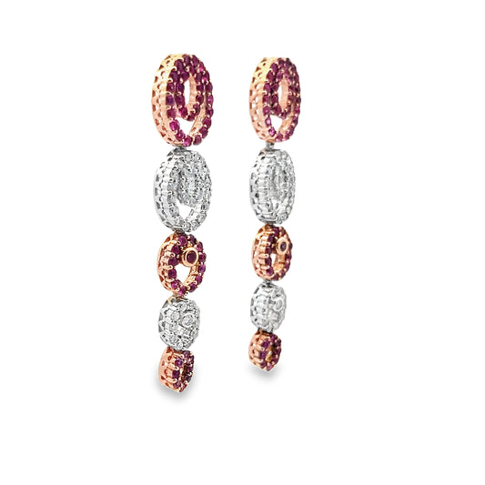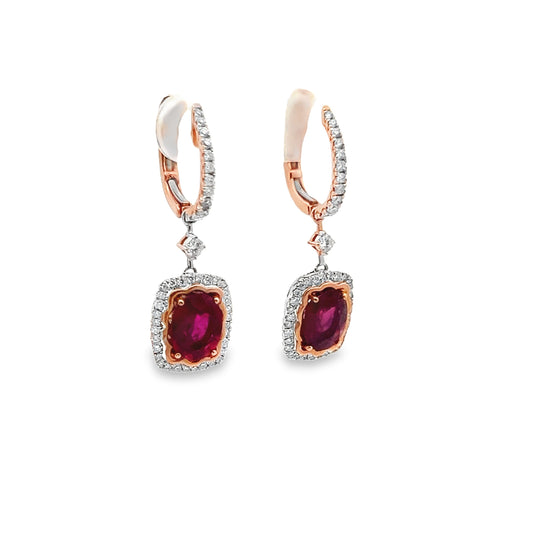 Ruby Lever-Back Diamond Halo Dangle Earrings in 18K White and Rose Gold
