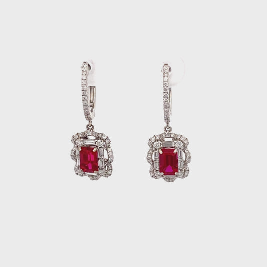 Ruby Leverback Drop Earrings with Double Diamond Halo in 14K White Gold