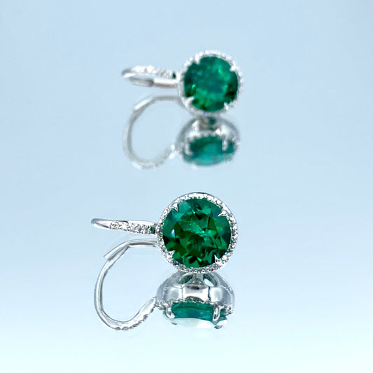 Floral Design Emerald and Diamond Leverback Drop Earrings in 14K White Gold