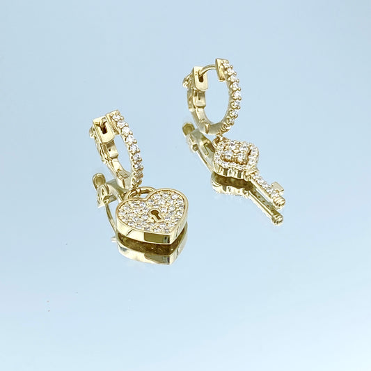 Heart Lock and Key Shape Diamond Drop Earrings in 14K Yellow Gold