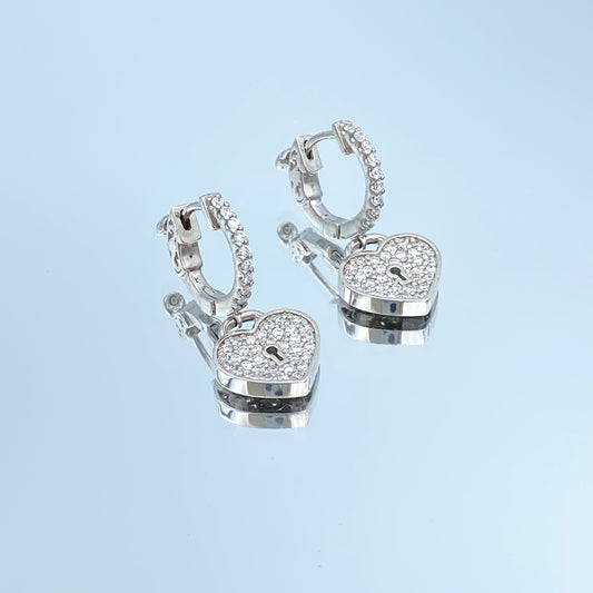 Heart Lock Diamond Drop Earrings in 14K White Gold