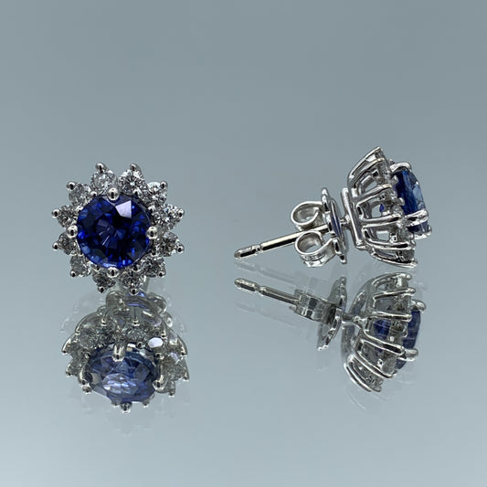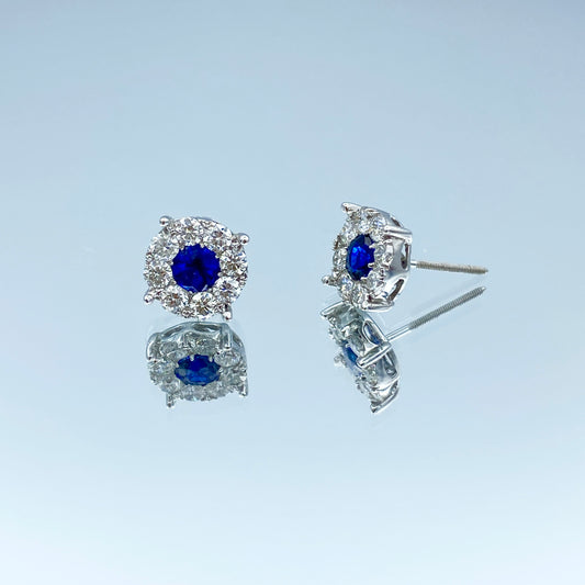 Round-Cut Blue Sapphire Stud Earrings with Diamond Halo in 14K White Gold