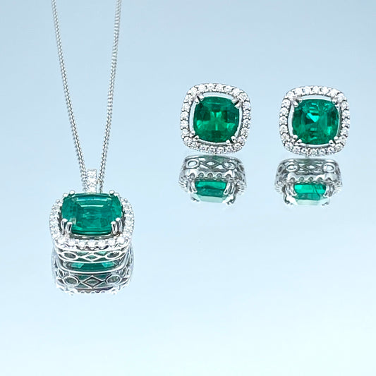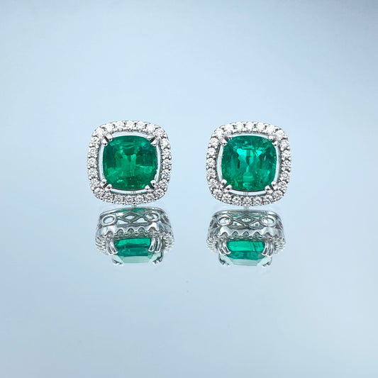 Emerald Earrings with a Diamond Halo in 14K White Gold
