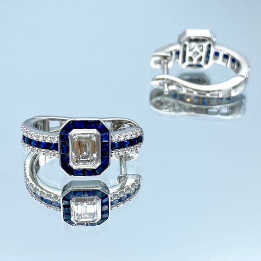 Diamond and Blue Sapphire Halo Lever back Earrings in 14K White Gold