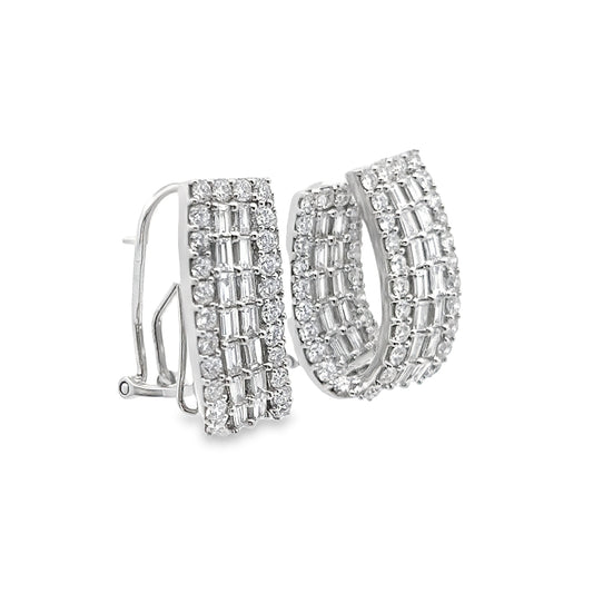 Baguette and Round Cut Diamond Omega Back Earrings in 18K White Gold