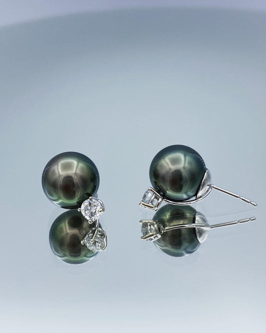 Black Tahitian Pearl Earrings with Diamond in 14K White Gold