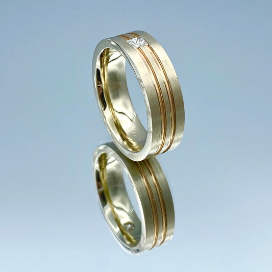 Two Tone Men's Wedding Ring with Princess-Cut Diamond in 14K Yellow and Rose Gold