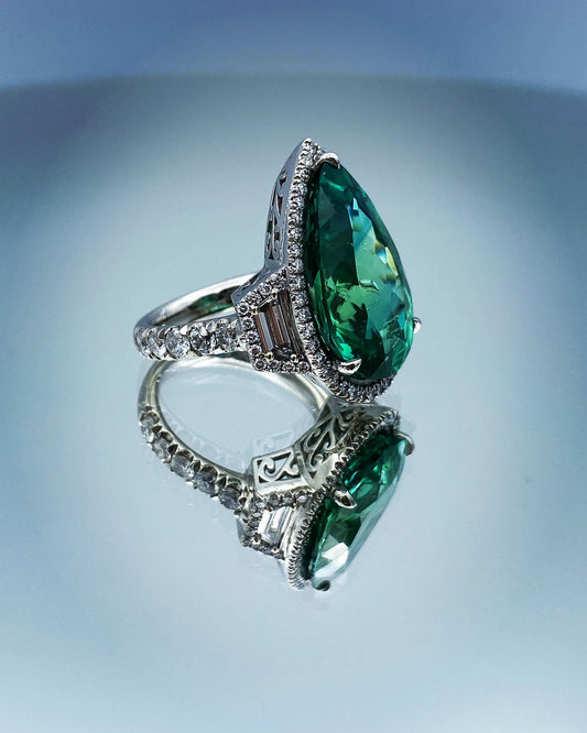 Pear Shape Green Kunzite Ring with Round Brillant-Cut Diamond Halo in Platinum
