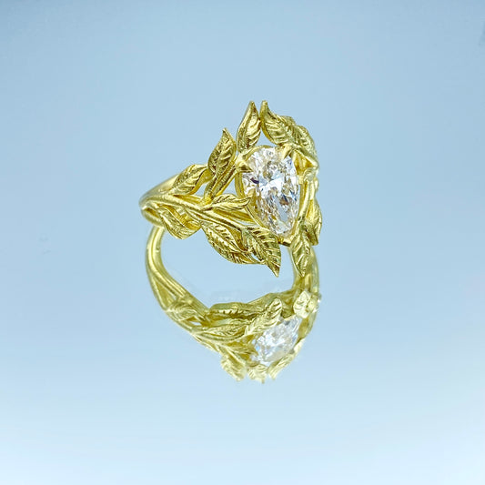 Floral Design Pear Shape Diamond Ring in 18K Yellow Gold