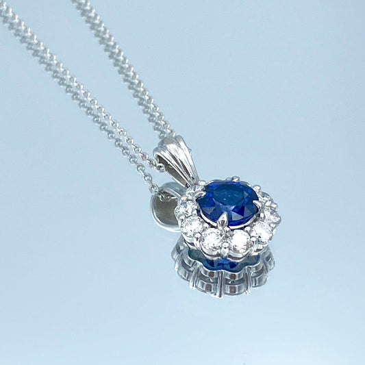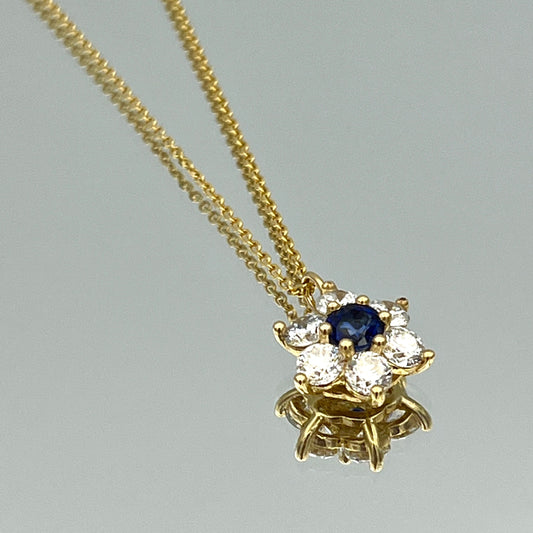 Floral Halo Design Blue Sapphire and Diamond Pendant in 14K Yellow Gold