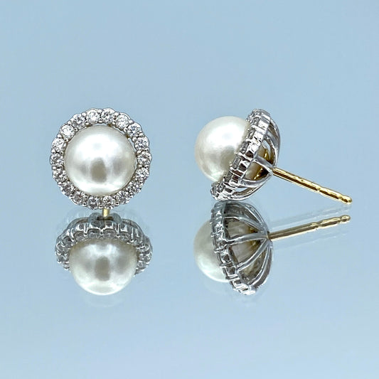 Pearl Stud Earrings with Diamond Halo in 14K White Gold