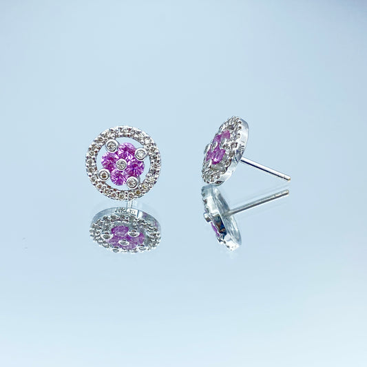 Halo Floral Shape Pink Sapphire and Diamond Stud Earrings in 14K White Gold