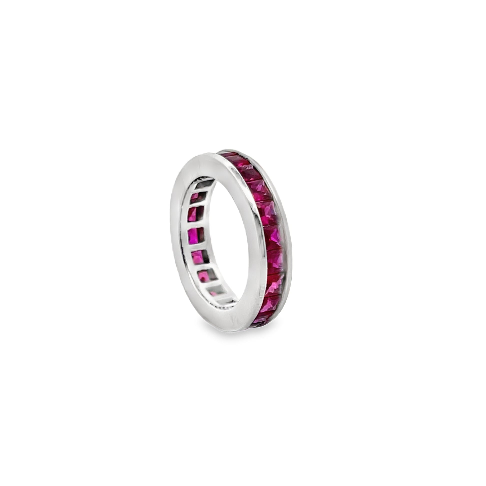 Channel set eternity ring is showcasing shimmering princess-cut ruby in 14k white gold. This ruby ring is ideal for daily wearing itself or stacked with other ring styles.