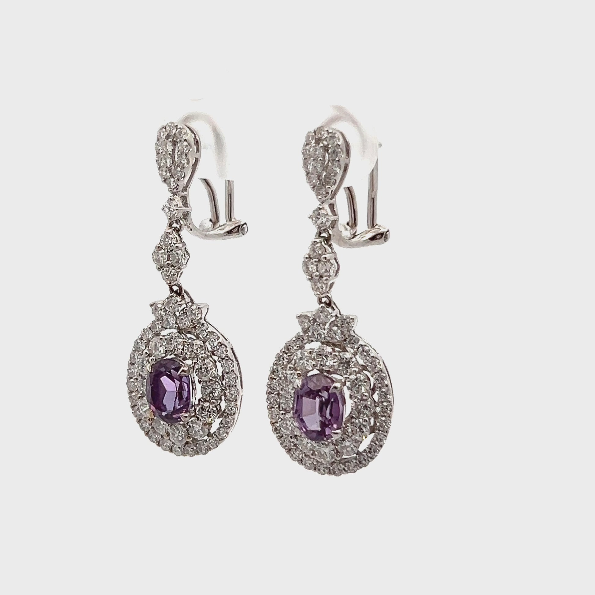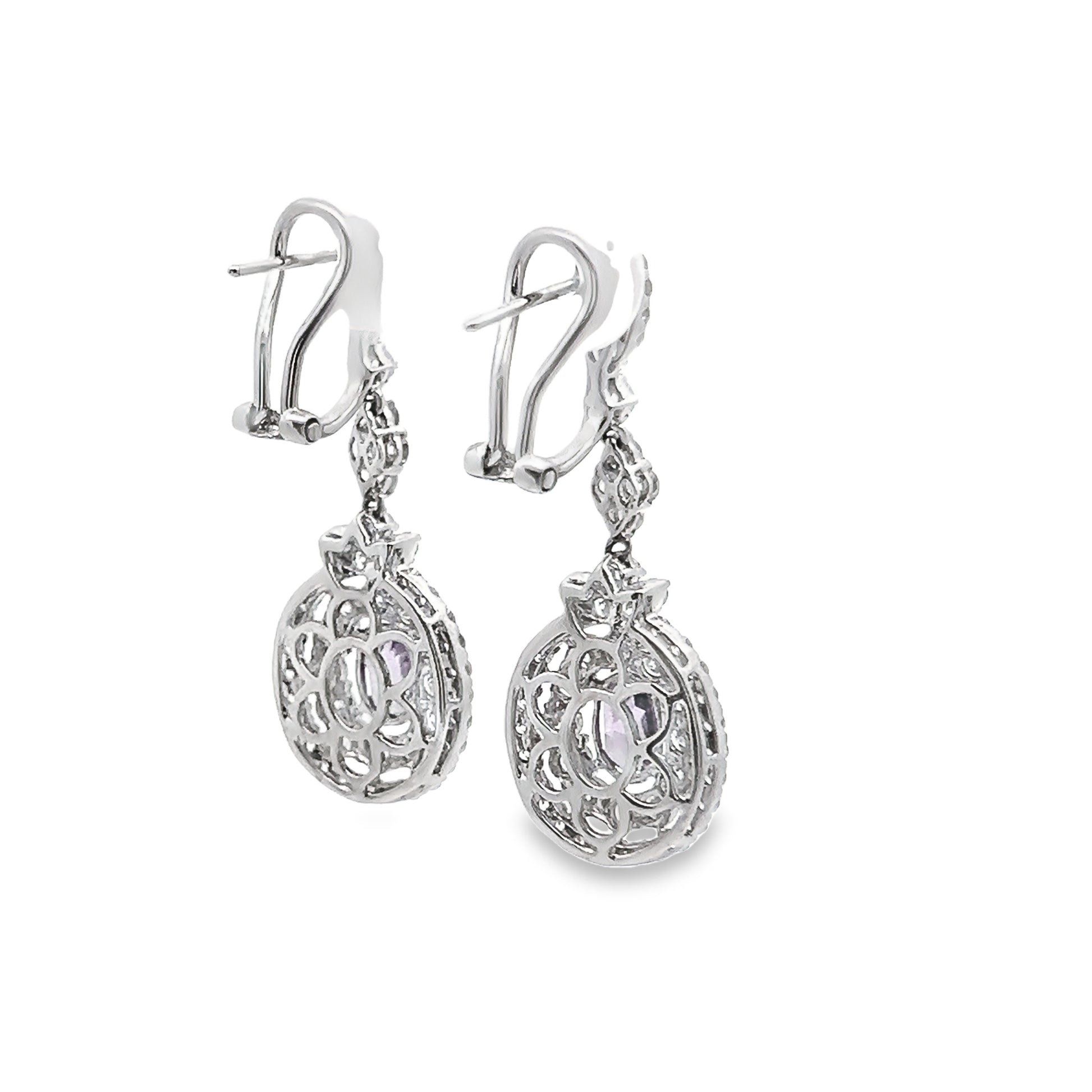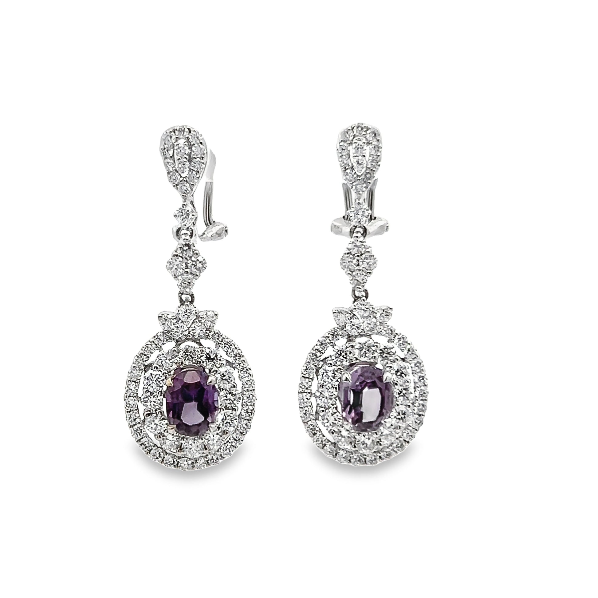 These timeless and feminine beauties feature oval-cut alexandrite and are surrounded by a double row of sparkling diamonds to offer distinct contrast. These dangle earrings are secured with omega backs.
