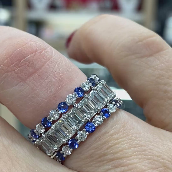 This ultimate alternating sapphire and diamond eternity ring is the perfect addition to your collection. It looks stunning worn alone but is delicate enough to stack with your other stacking rings.
