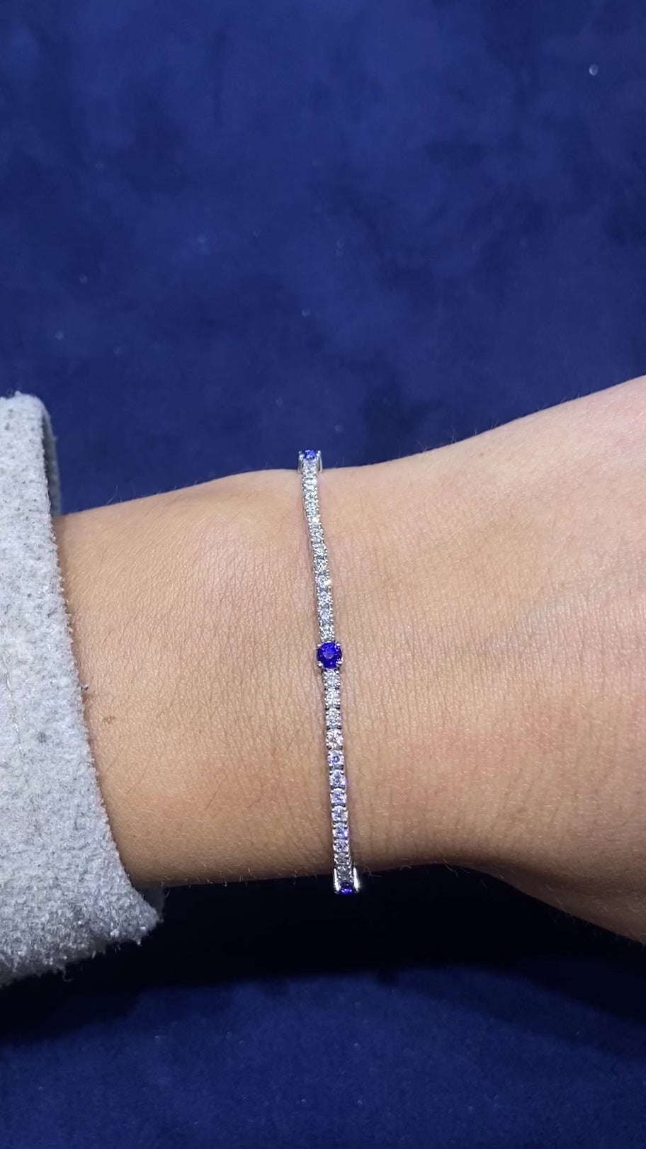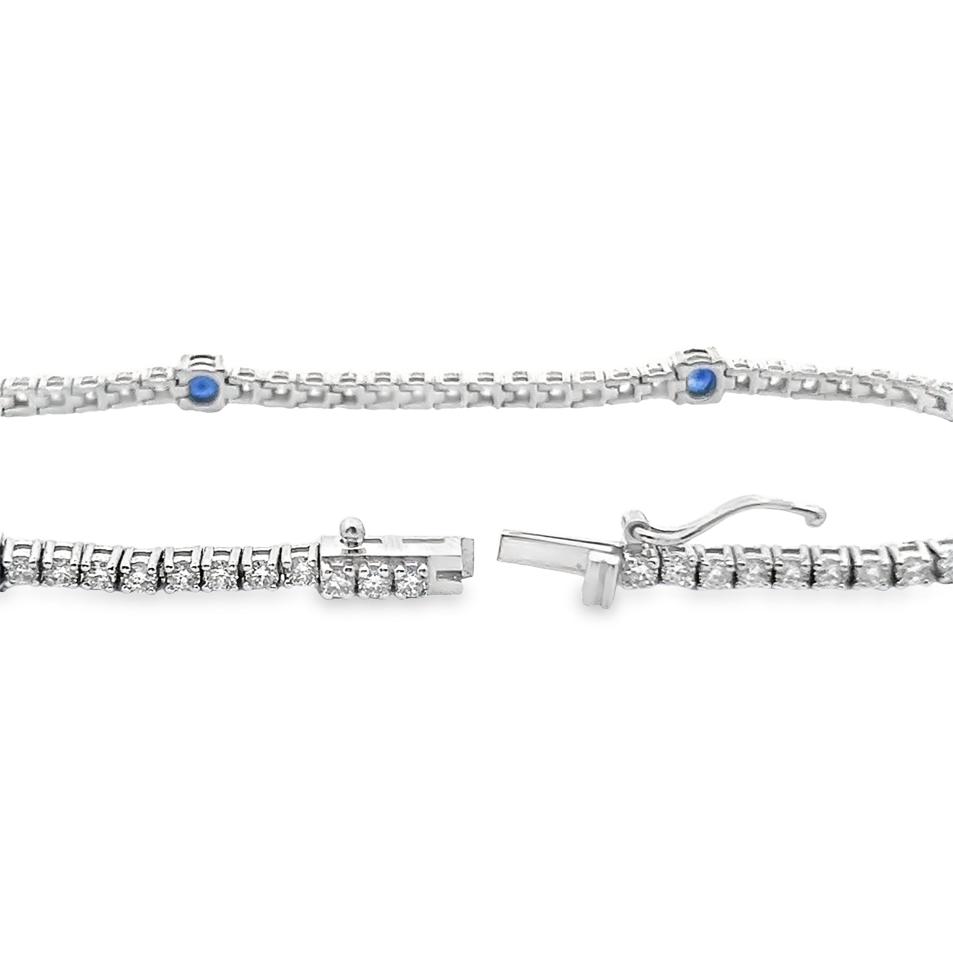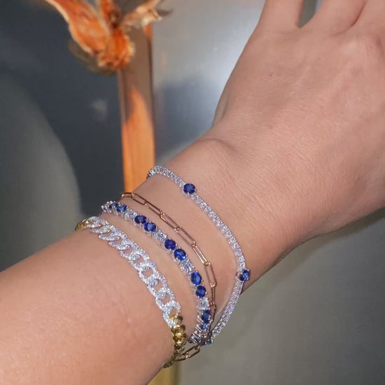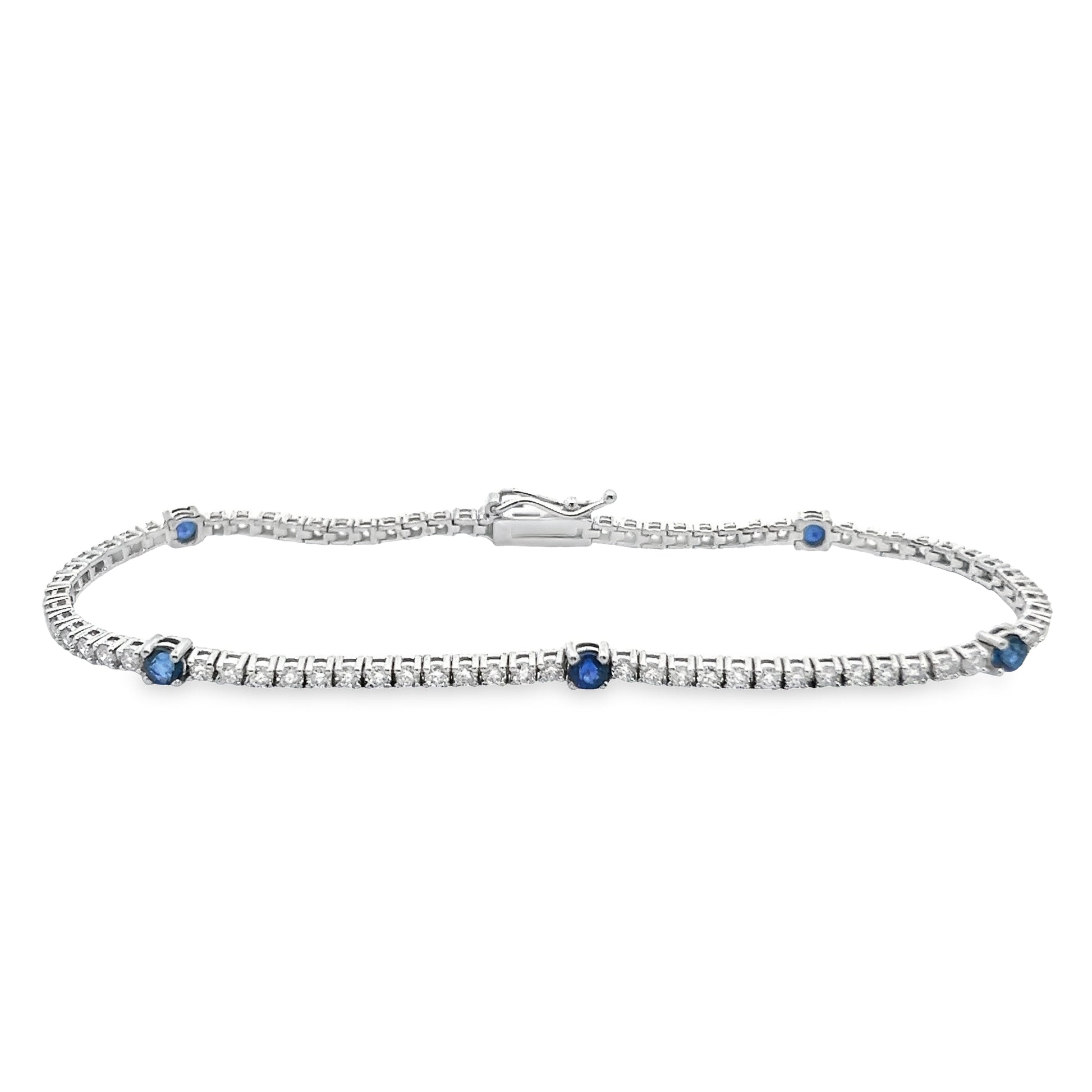 This exquisite bracelet features alternating diamonds and blue sapphires. Crafted with the highest quality gems, this bracelet is sure to make a lasting impression with its timeless appeal. It's precisely fitted links are guaranteed to make a lasting statement of sophistication and exclusivity. Enjoy the sparkle and vibrancy of these precious stones for years to come.