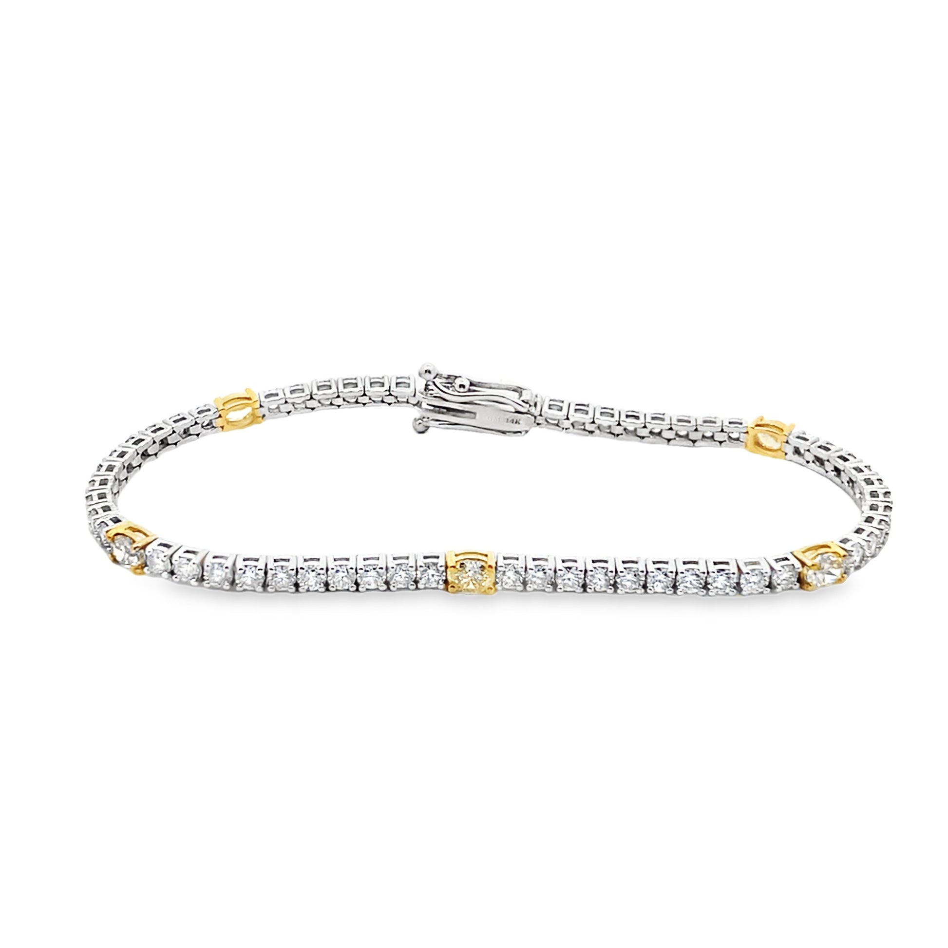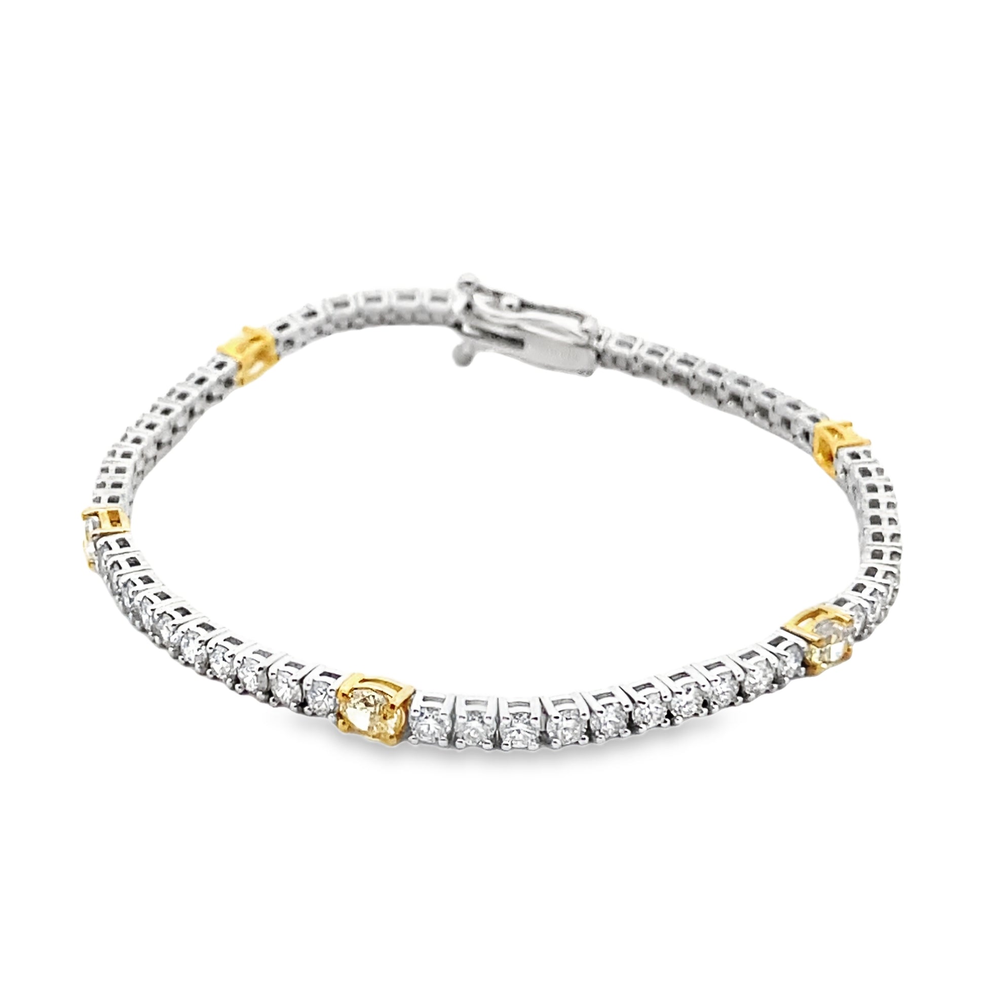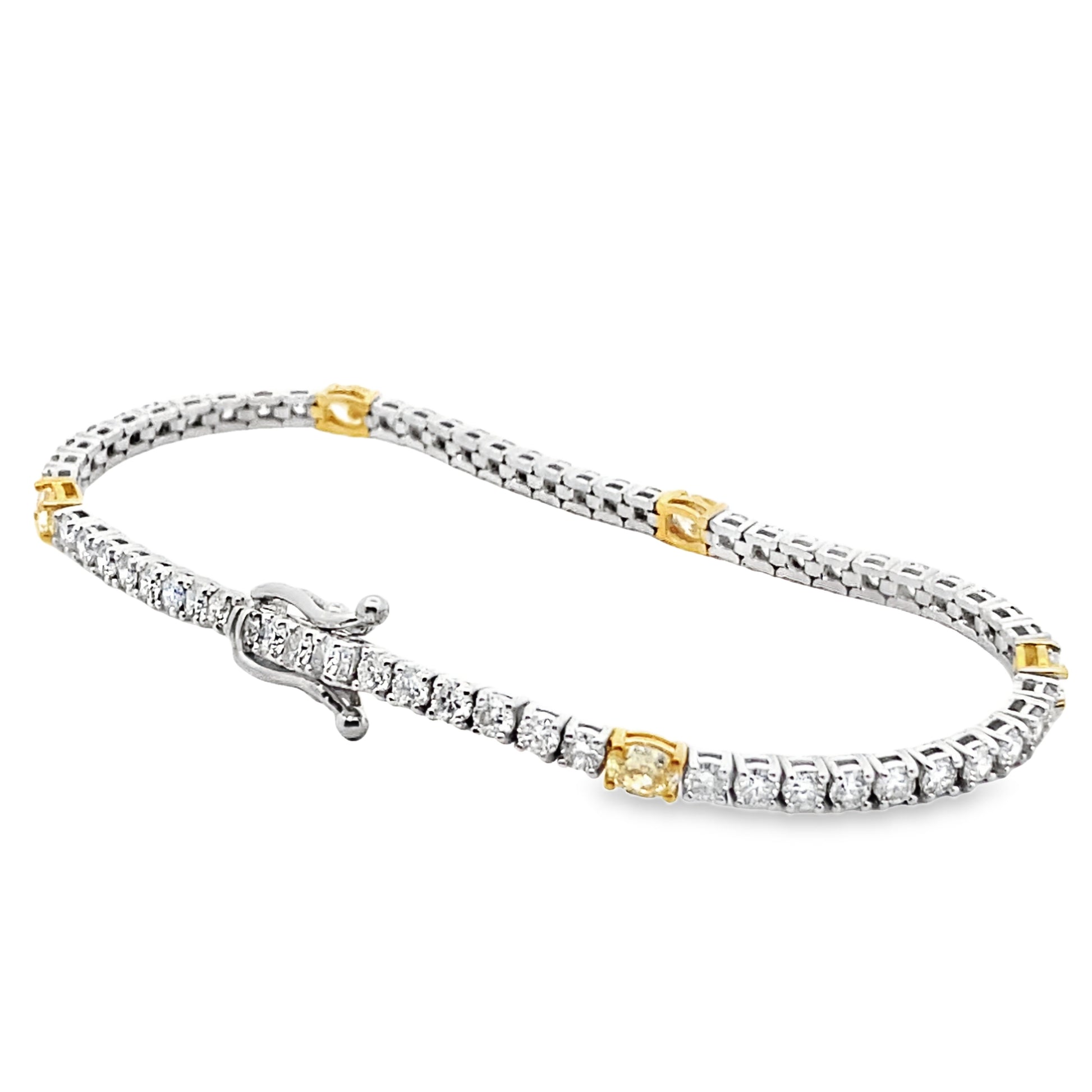 Add a touch of elegance to your outfit with our Alternating Fancy Yellow Diamond Tennis Bracelet. Crafted with 14K White Gold, this beautiful bracelet features alternating Fancy Yellow diamonds that will catch and reflect the light, making you stand out in any crowd. Elevate your style with this luxurious and exclusive piece.
