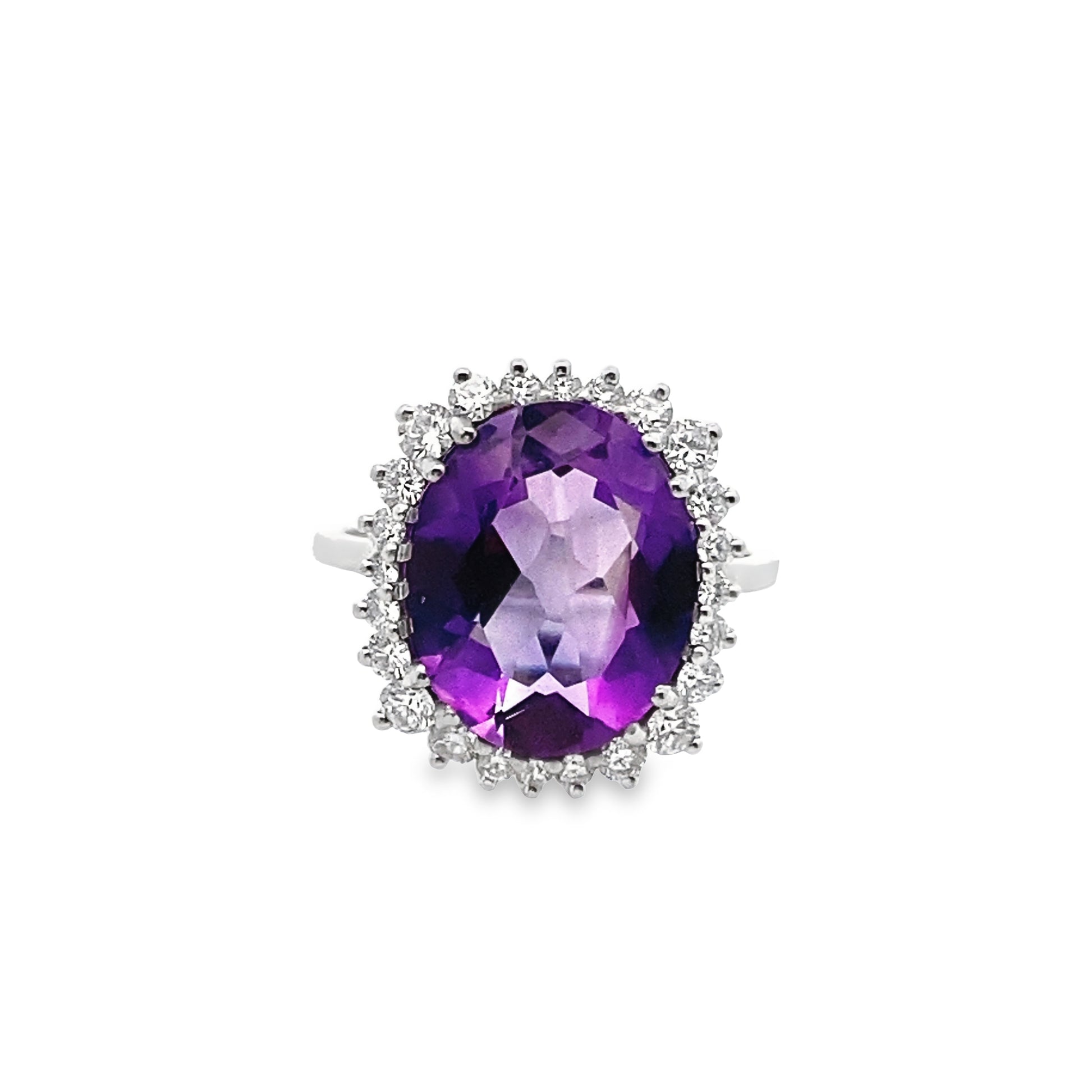 This velvety purple, oval-cut Amethyst ring is sure to bring an elegant touch to any ensemble. Crafted in 14k white gold, the vibrant amethyst is framed by a sparkly halo of diamonds for a stunning combination of luxury and style.