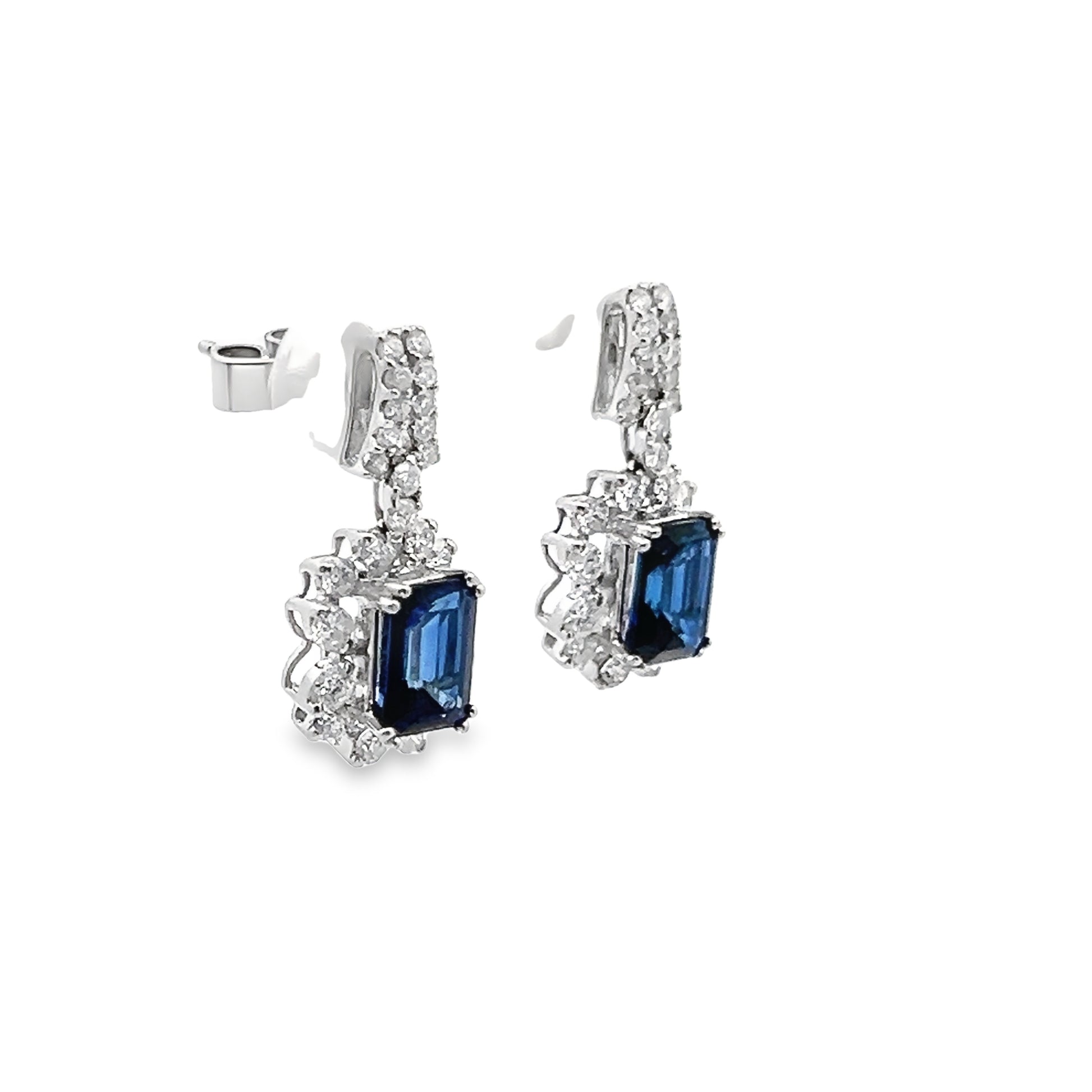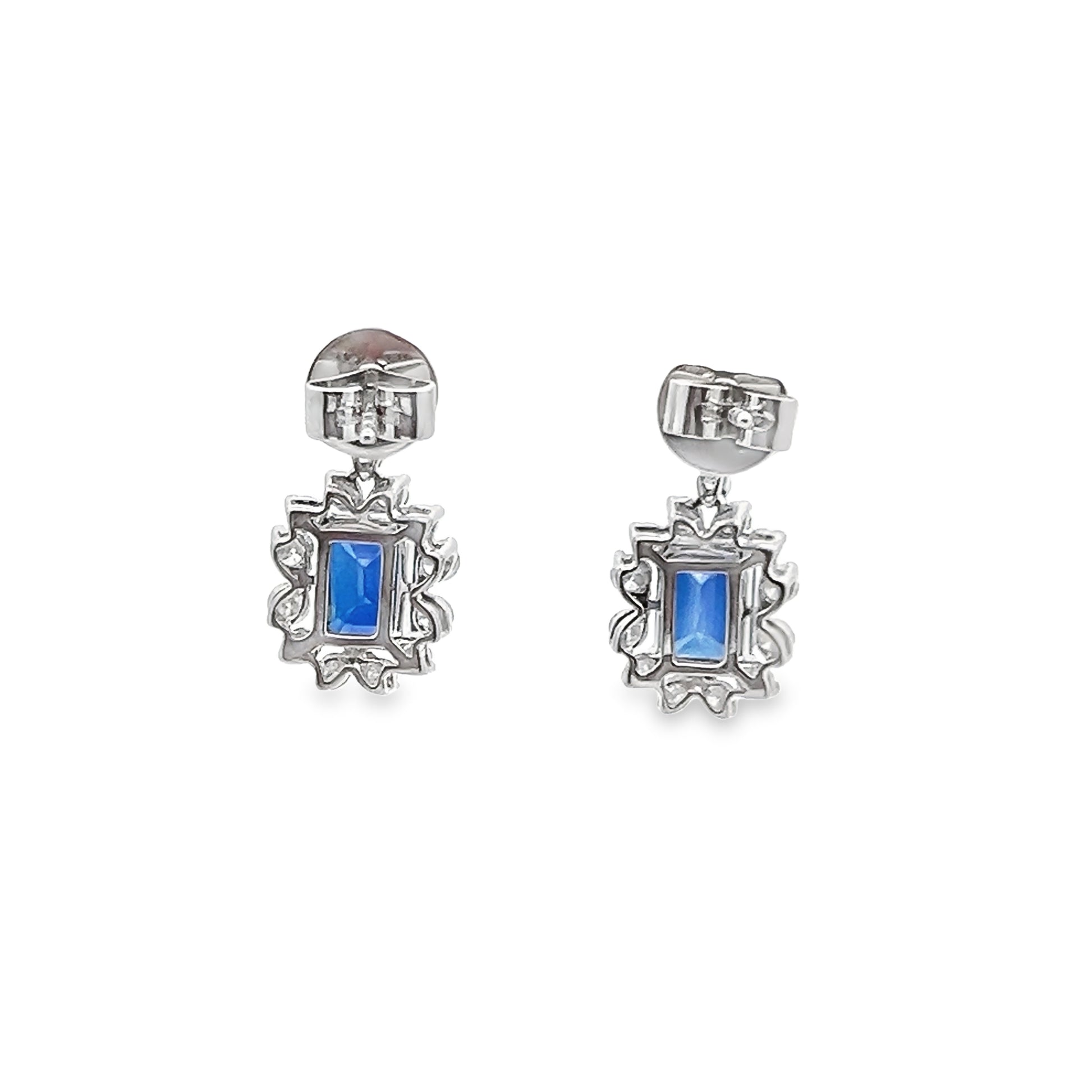 Blue Sapphire Drop Earrings with Diamond Halo in 18K White Gold