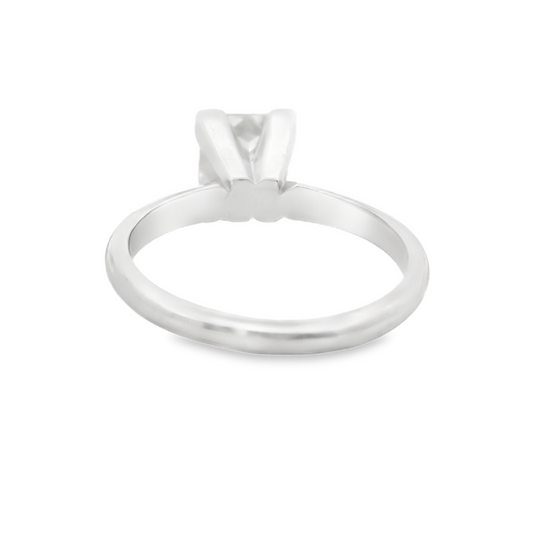 This engagement ring features a princess-cut set high above the simple band. The effect is very traditional with clean lines and nothing to distract from the elegance. The simple band has cathedral shoulders that angle up toward the stone and flow down to the band. This solitaire engagement ring is simply perfection