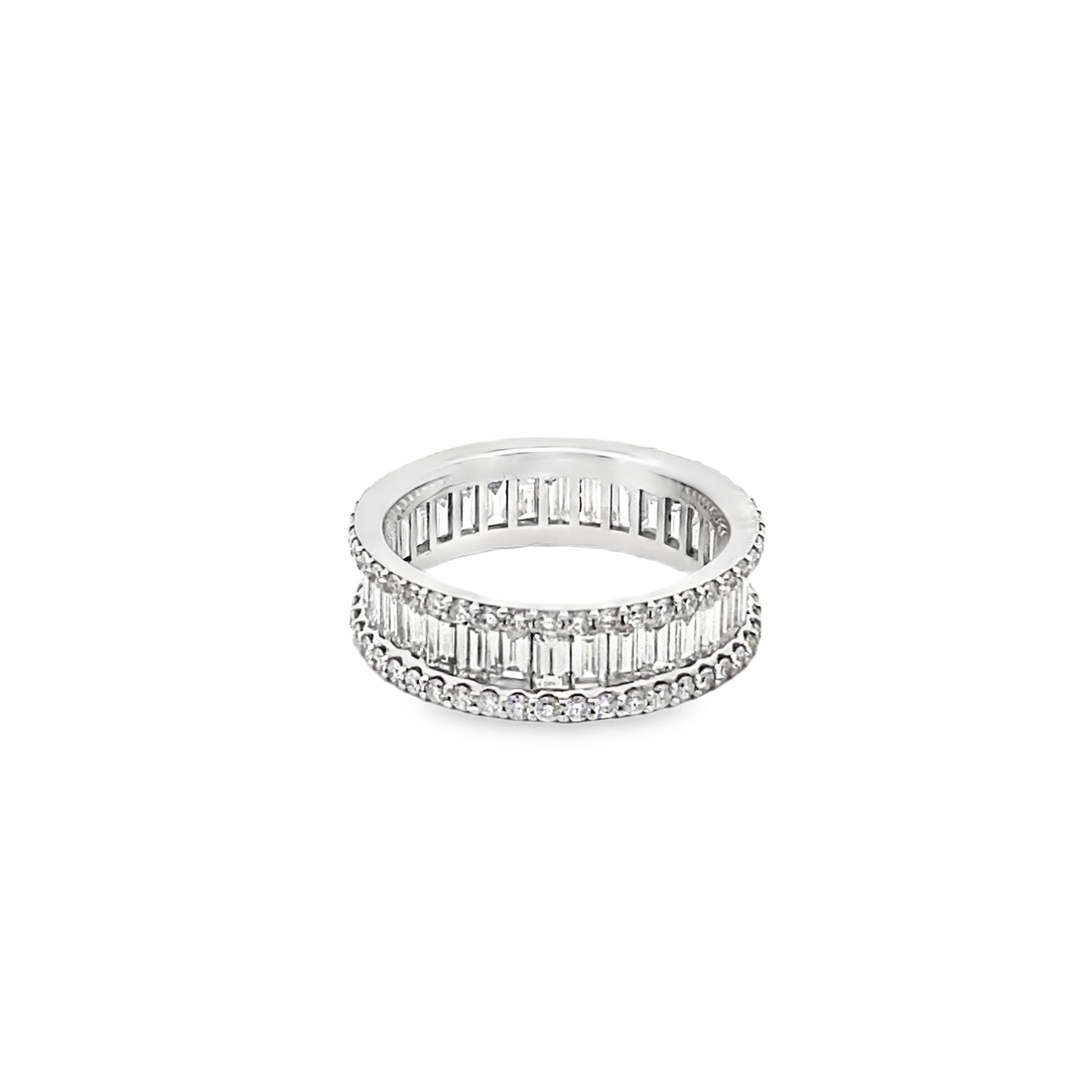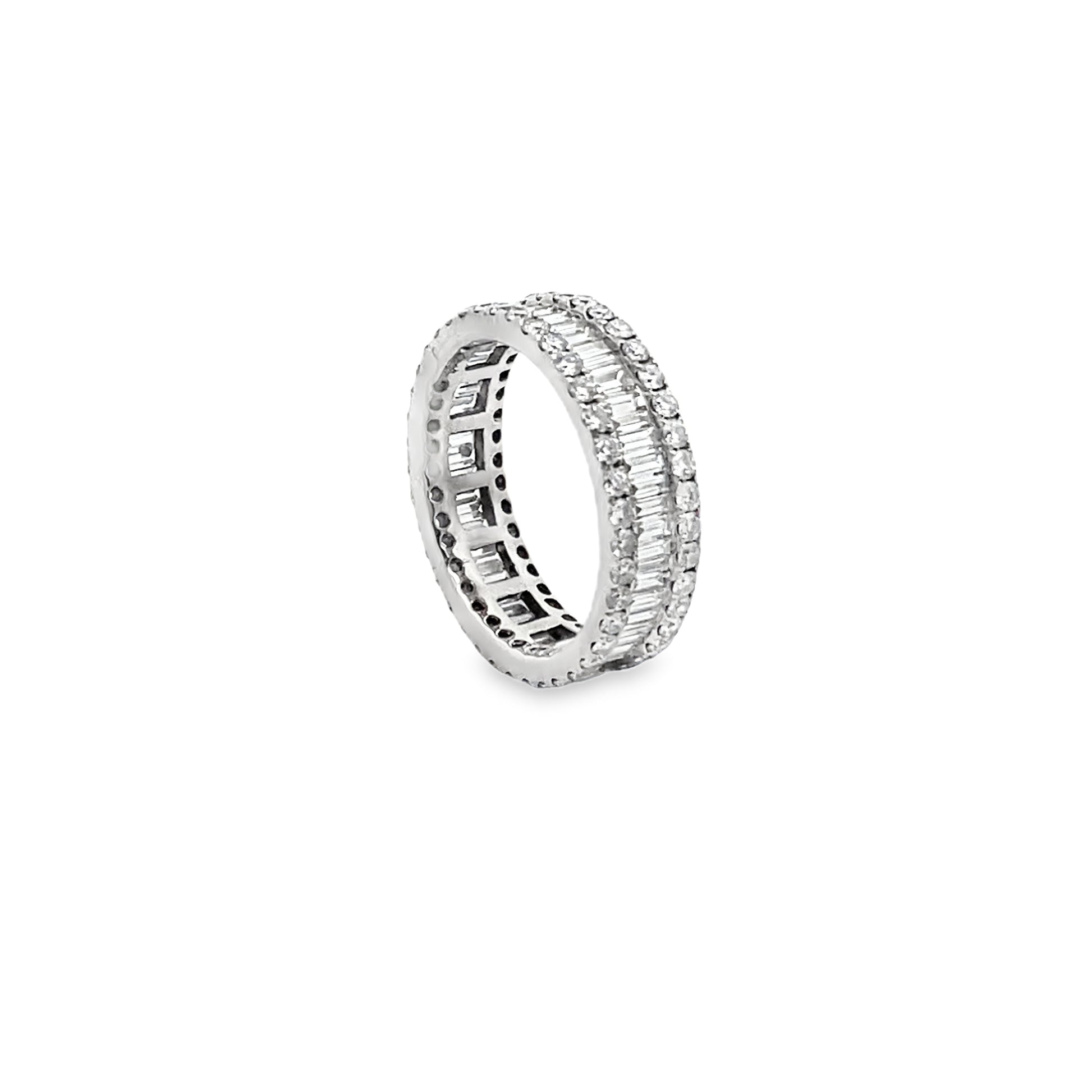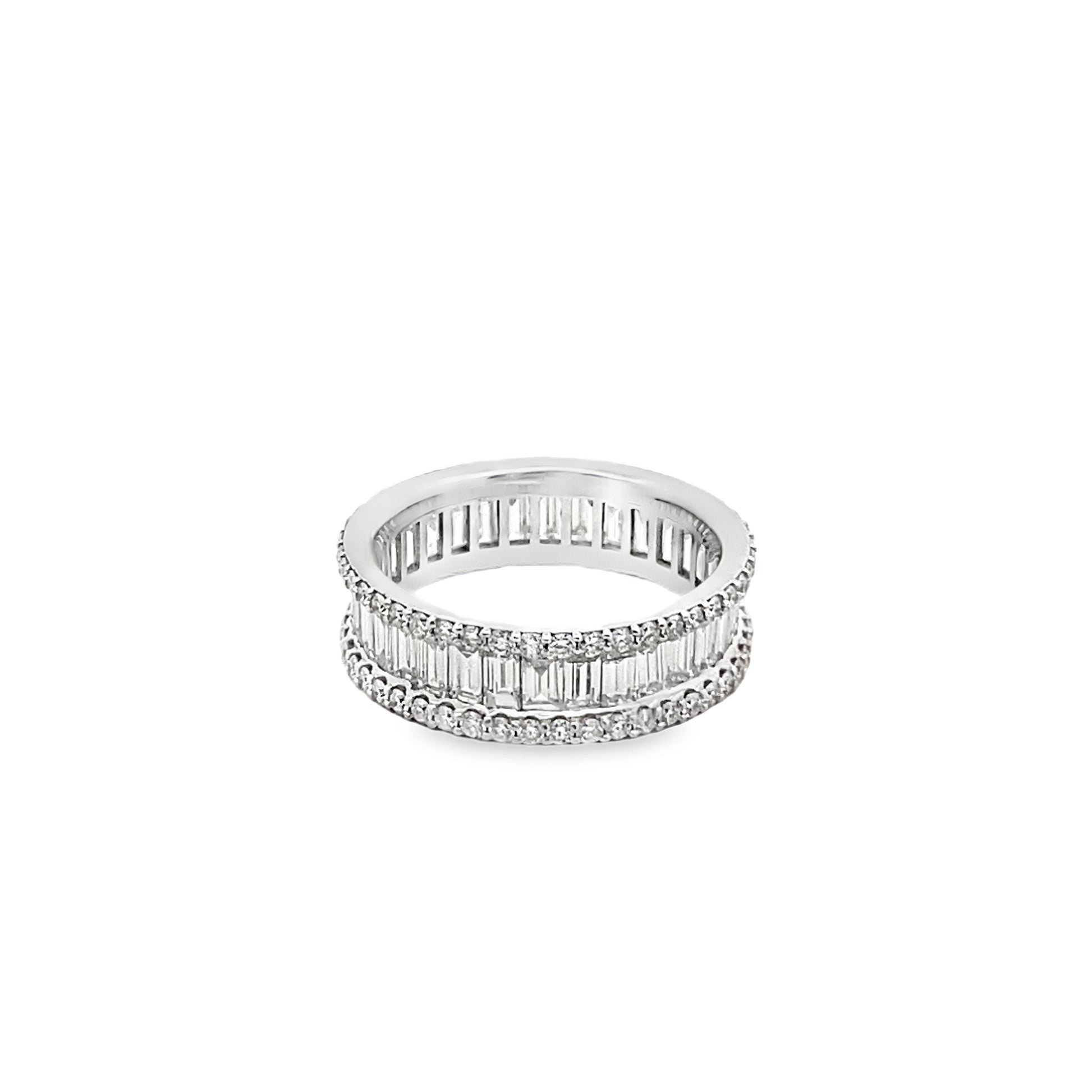 This alluring channel set full eternity ring is featuring one row of vertically set baguette-cut diamonds, encased by two rows of round brilliant-cut diamonds on the sides. This immensely desirable piece of jewelry stands out and catches the eye wherever you go!