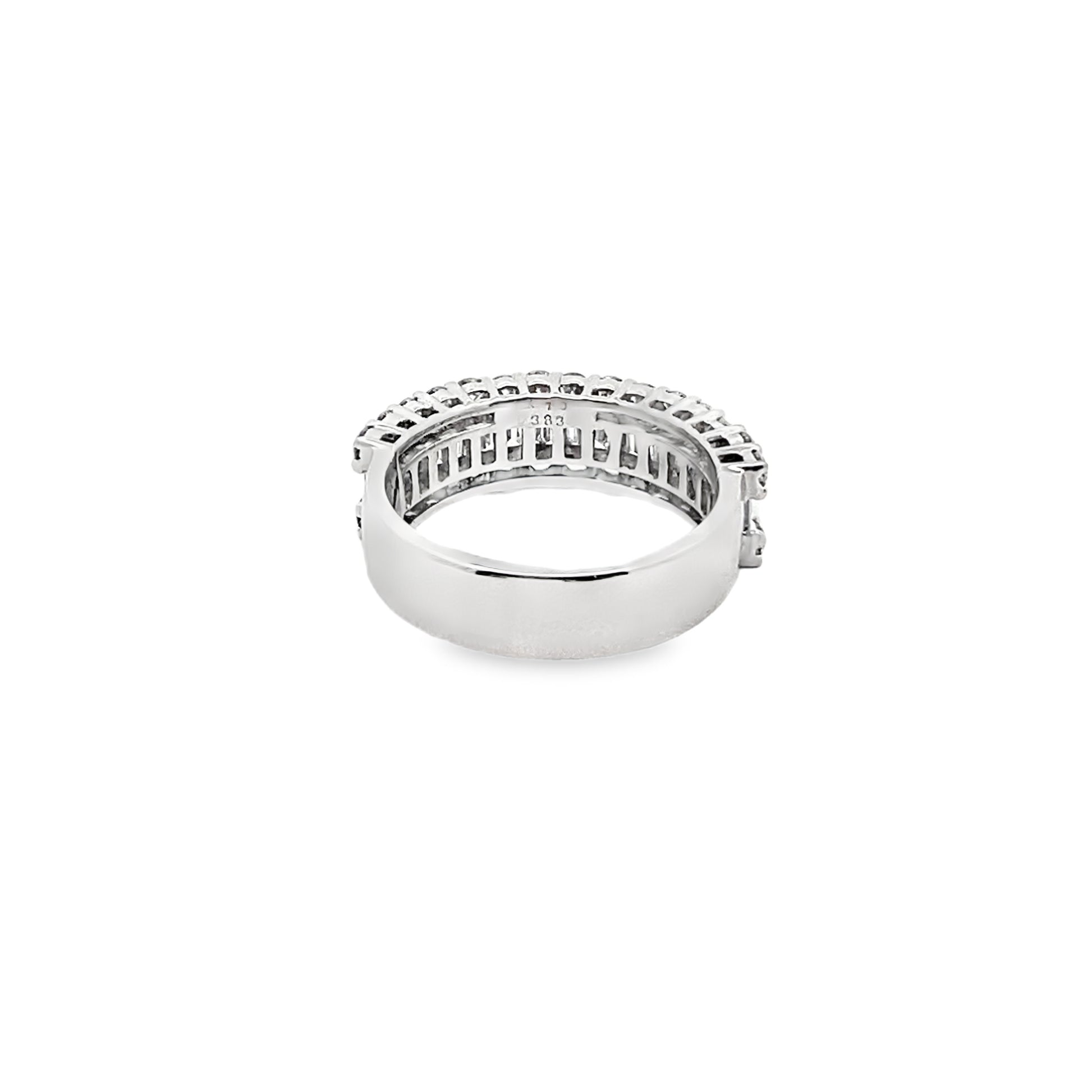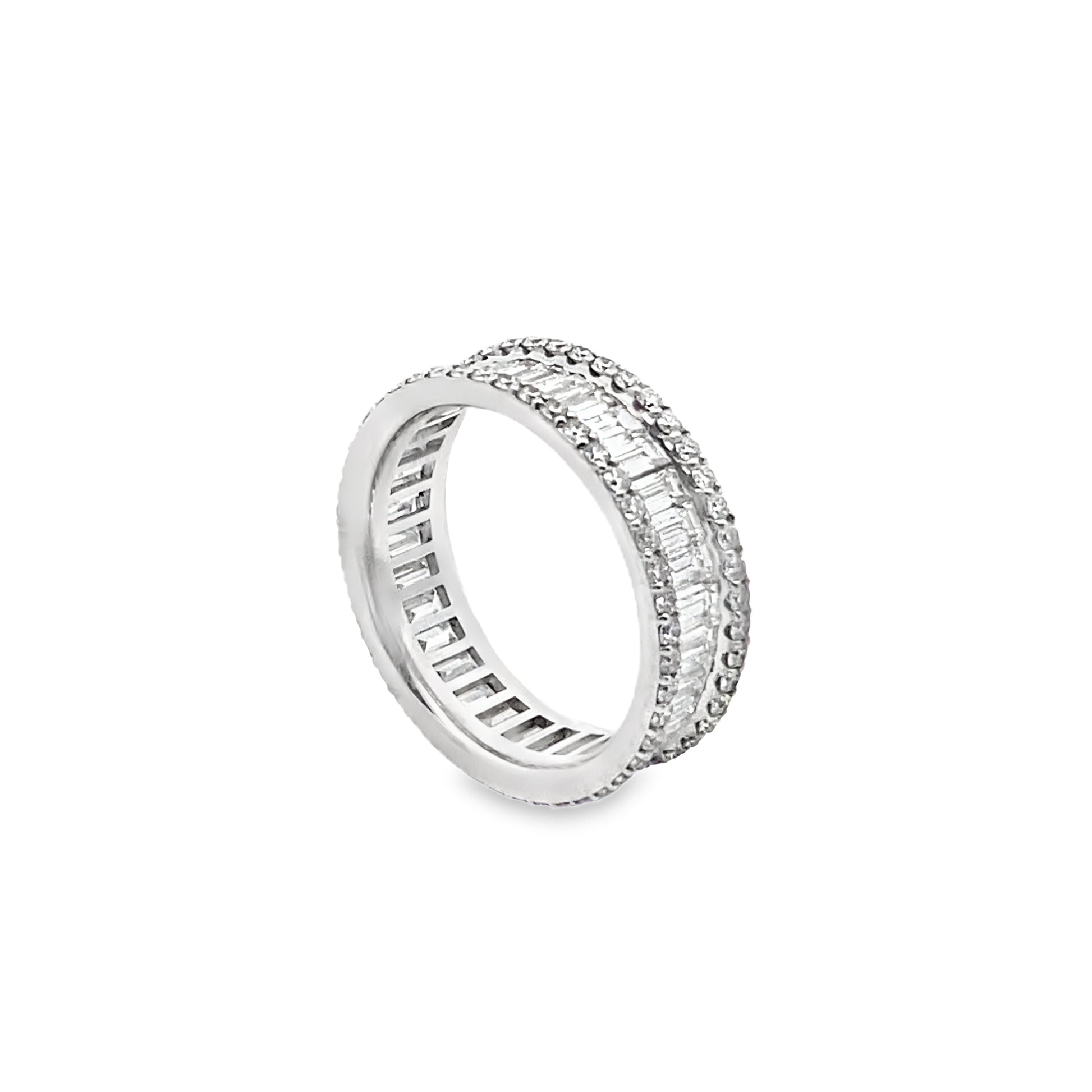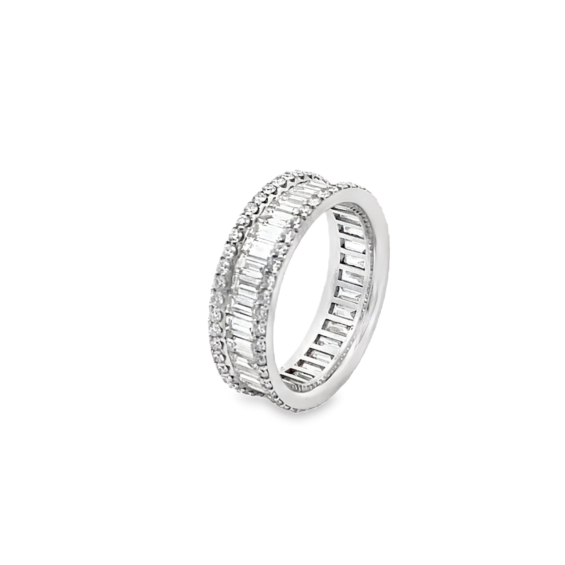 This alluring channel set full eternity ring is featuring one row of vertically set baguette-cut diamonds, encased by two rows of round brilliant-cut diamonds on the sides. This immensely desirable piece of jewelry stands out and catches the eye wherever you go!