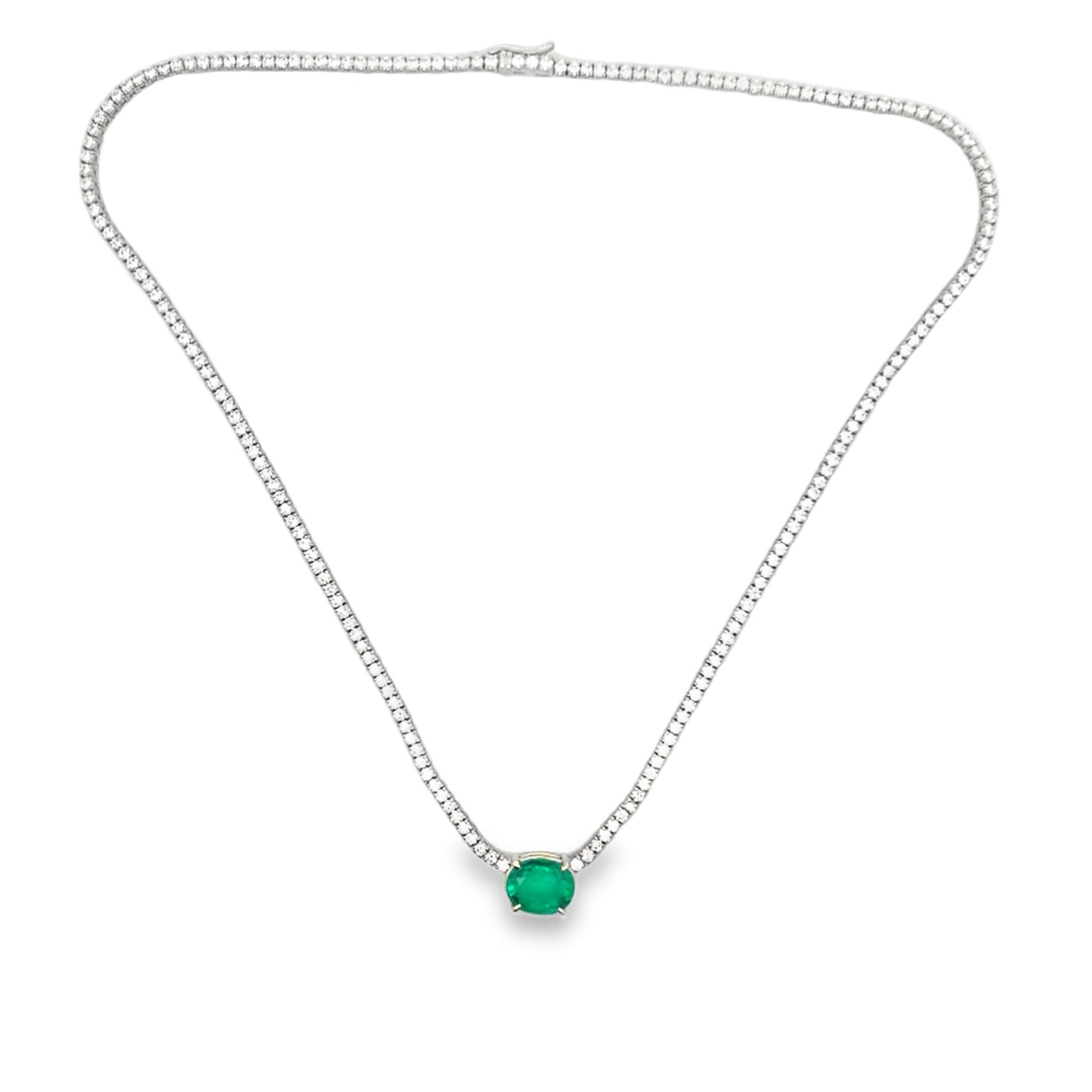 Elevate your everyday elegance with this stunning tennis necklace, featuring a vibrant emerald center stone complemented by a continuous line of brilliant diamonds. With Dani Austin's vision and Abraham's craftsmanship, this necklace is an essential addition to any fine jewelry collection. This piece can be customized with any gemstone of preference and to any carat of liking.
