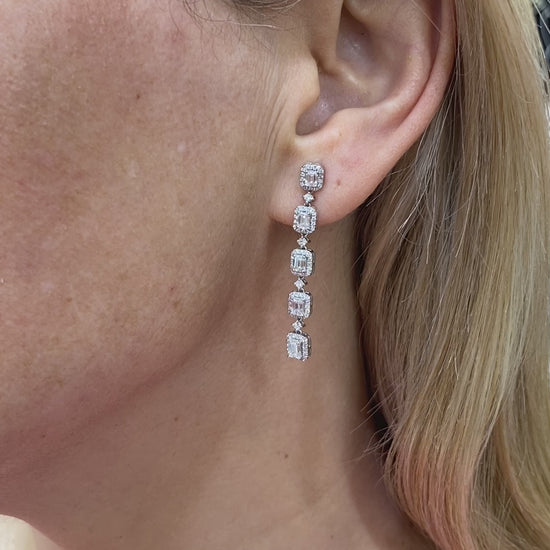 Baguette Halo Diamond Drop Earrings in 14K White Gold