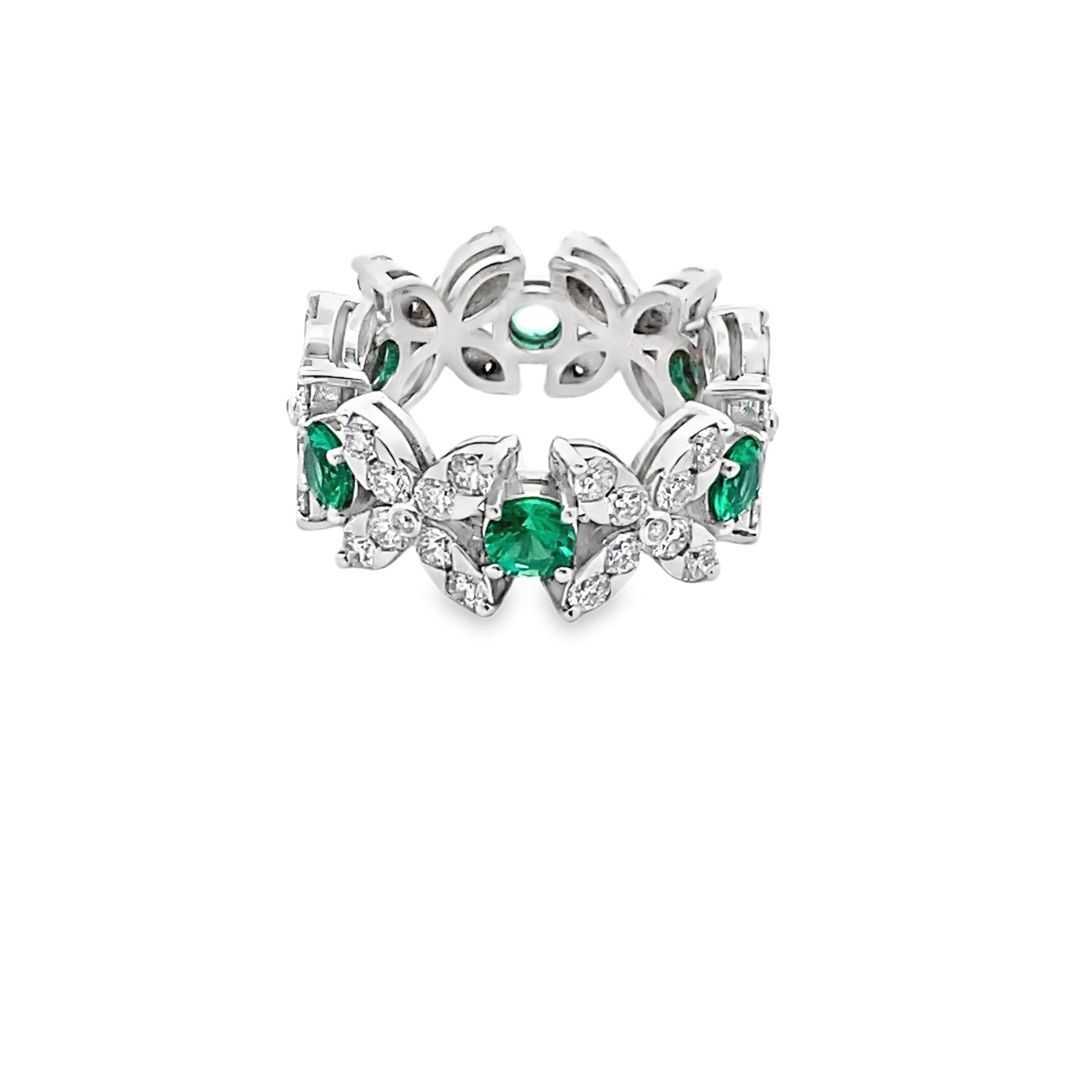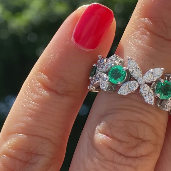 The alluring and dramatic beauty of this round brilliant-cut emeralds and diamonds uses a unique combination for a distinctly romantic sensibility.