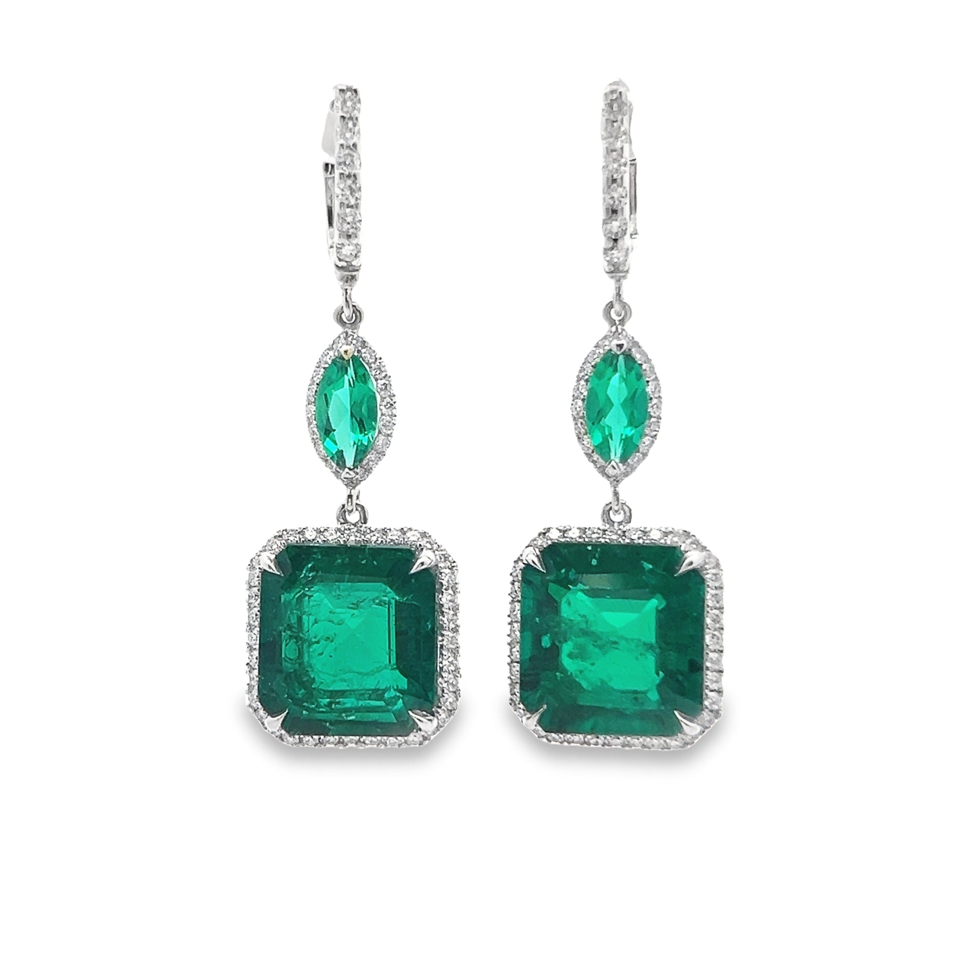 Emerald Lever Back Dangle Earrings with Diamond Halo in 14K White Gold