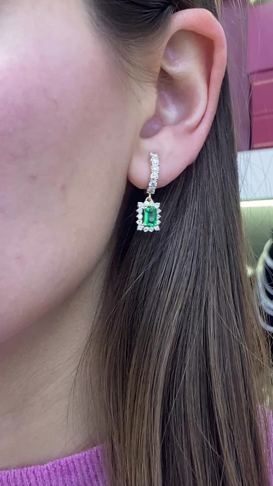 Emerald and Diamond Halo Hoop Drop Earrings in 14K Gold