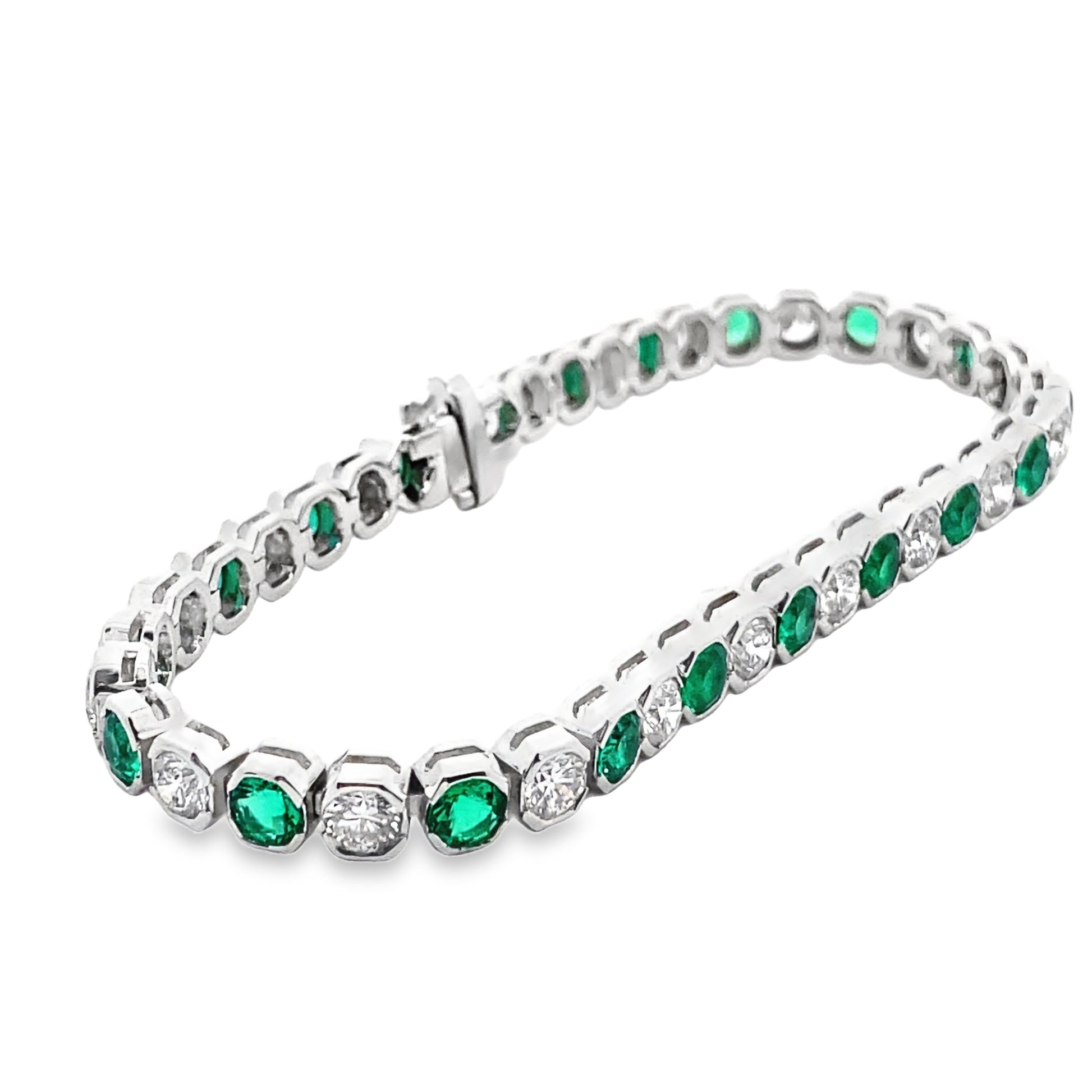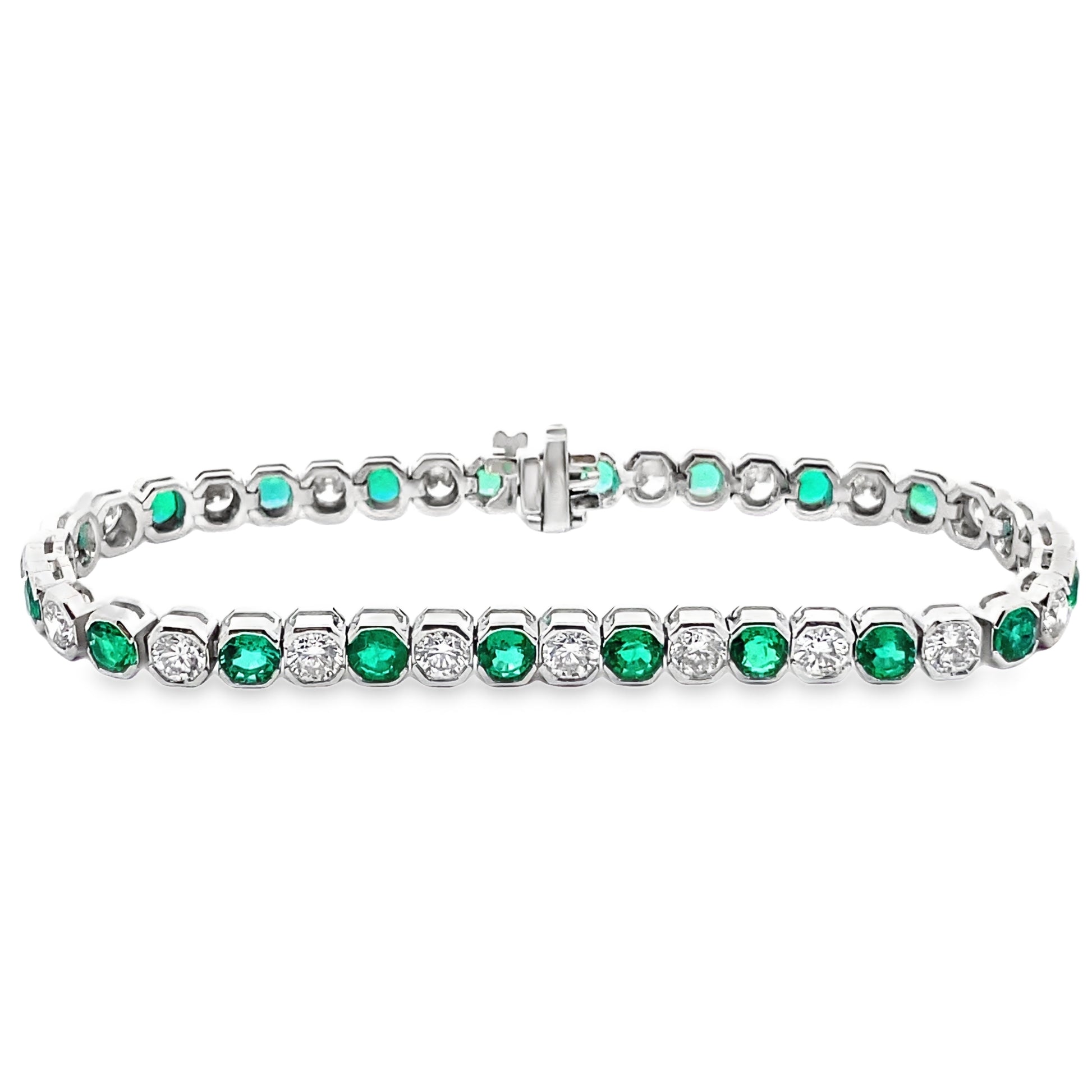 This stunning alternating emerald and diamond tennis bracelet adds a touch of elegance to any outfit. The vivid emeralds and sparkling diamonds are set off in alternating rows for an eye-catching design.