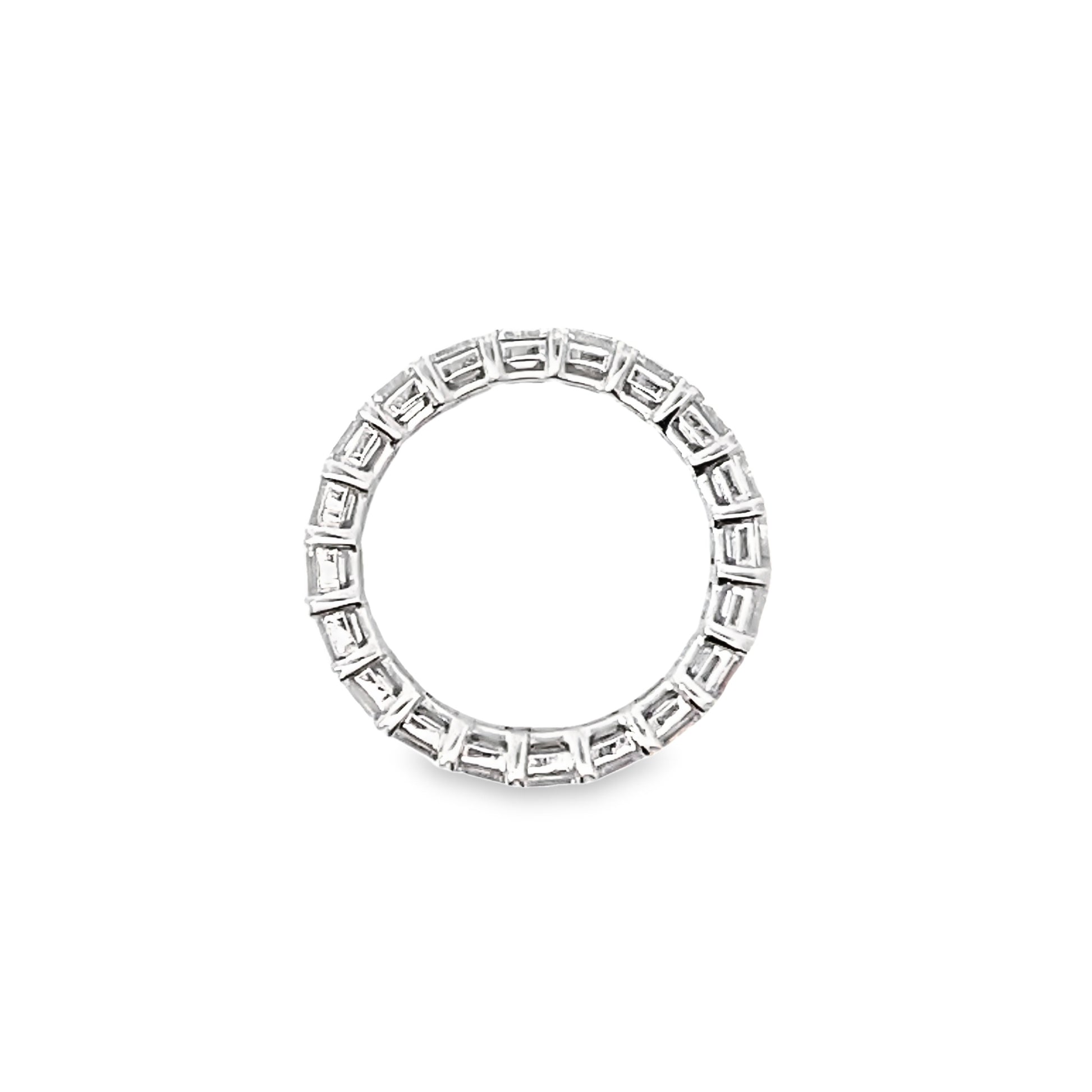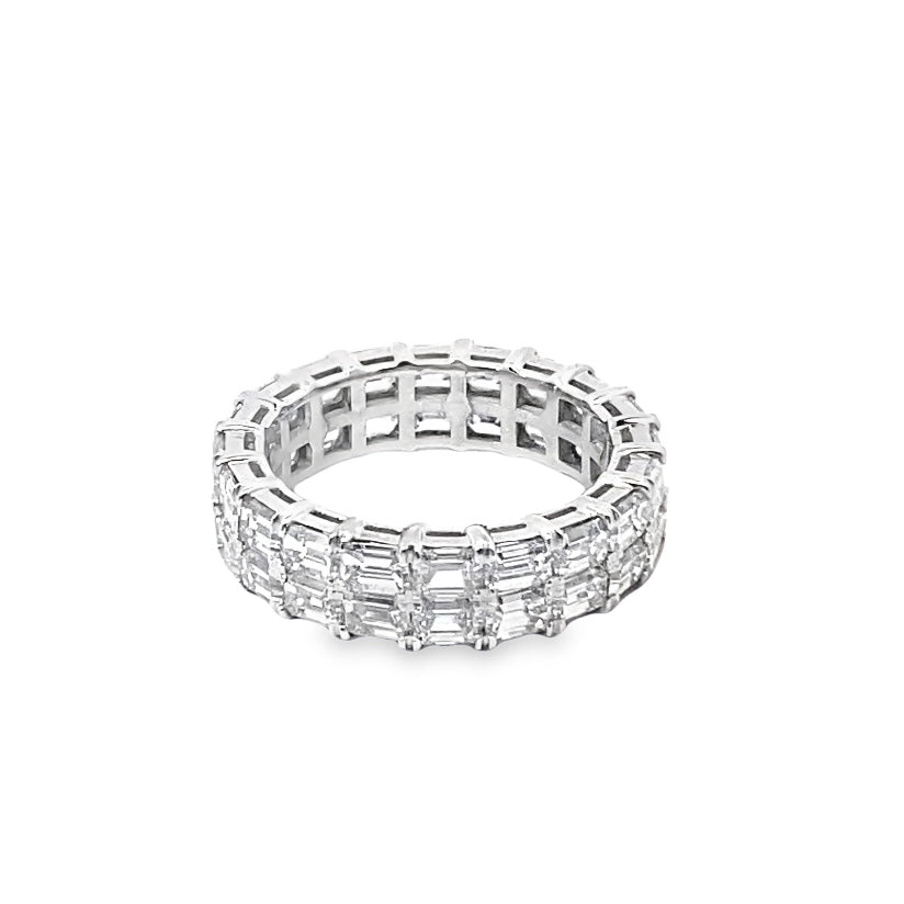 This GIA grade E/F color, VS1 clarity emerald-cut diamond eternity band can be a beautiful wedding ring or an anniversary ring. Also, add it to a stack of other eternity rings for an on-trend right-hand look