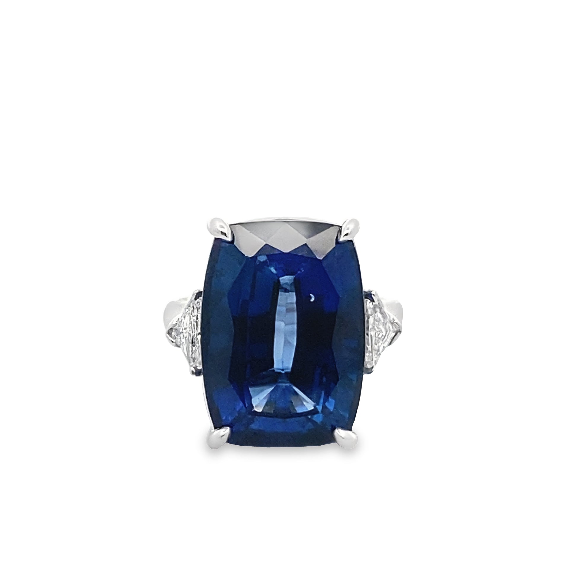 This alluring emerald-cut blue sapphire's defined and sophisticated beauty is held between two trapezoid diamonds. Secured in prong settings and enchants every discerning eye
