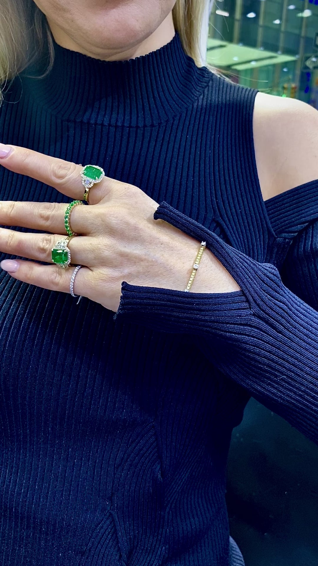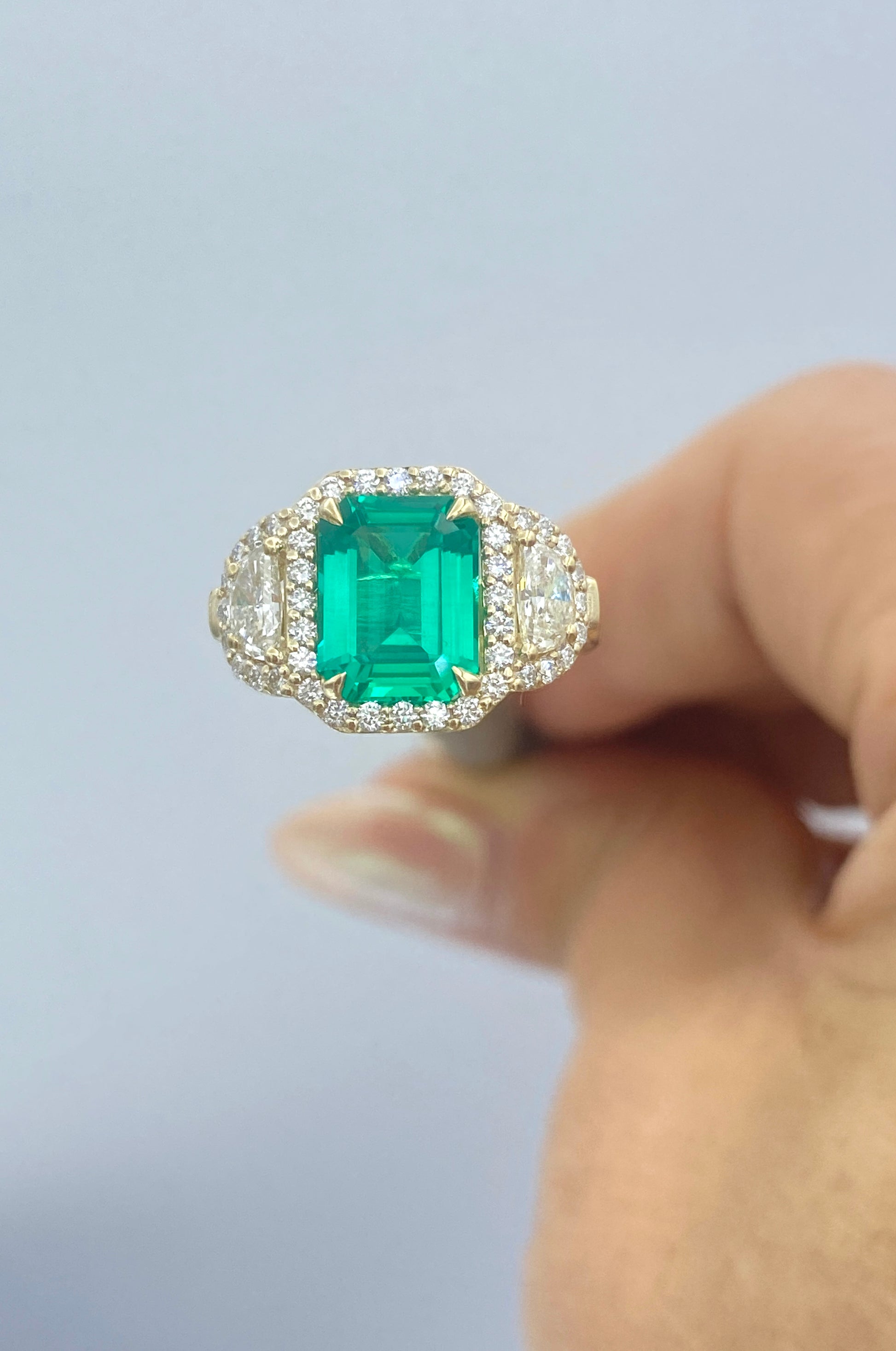 This emerald's alluring and dramatic beauty is surrounded by brilliant diamonds all the way around. This unique and modern gemstone is beautifully set in a claw-prong setting.