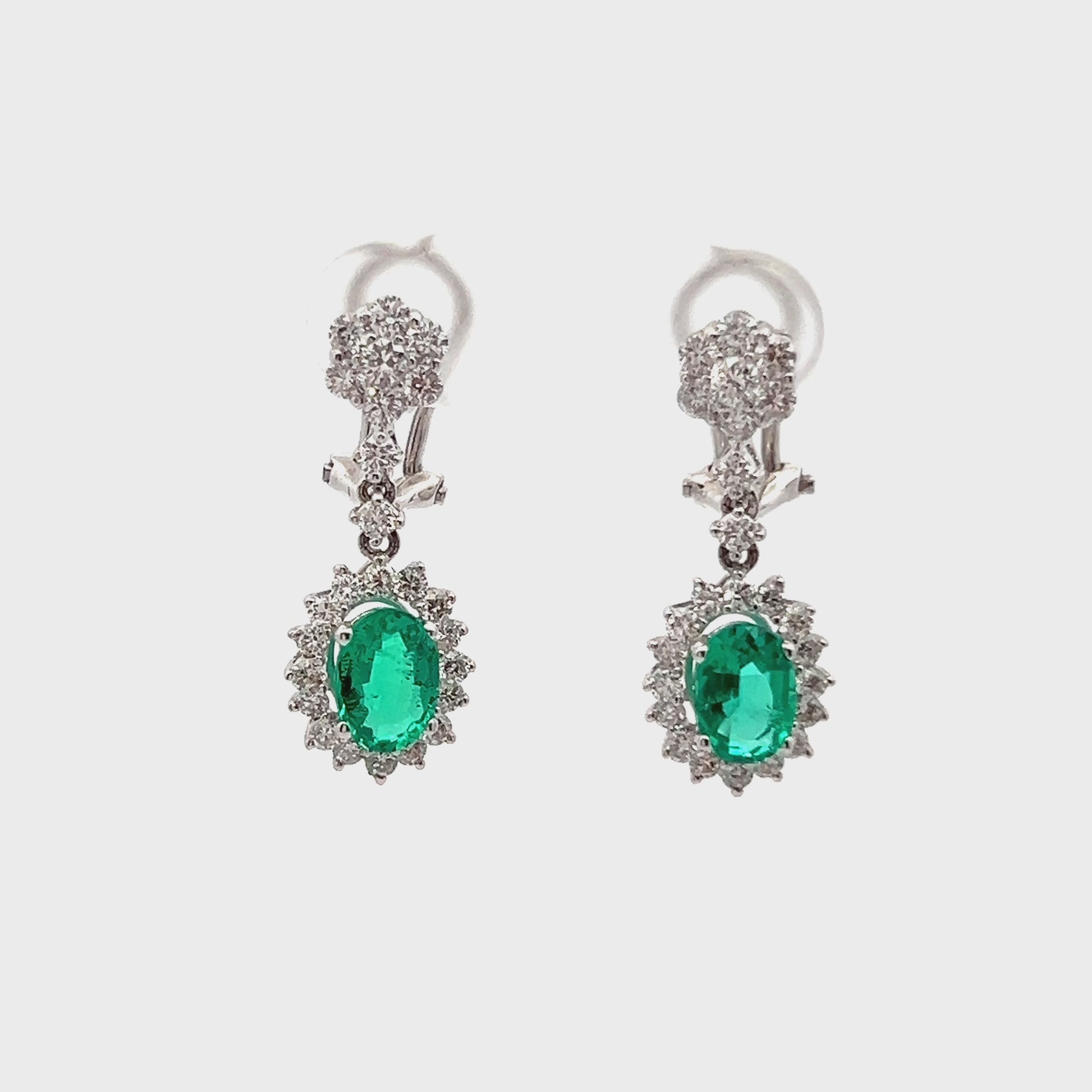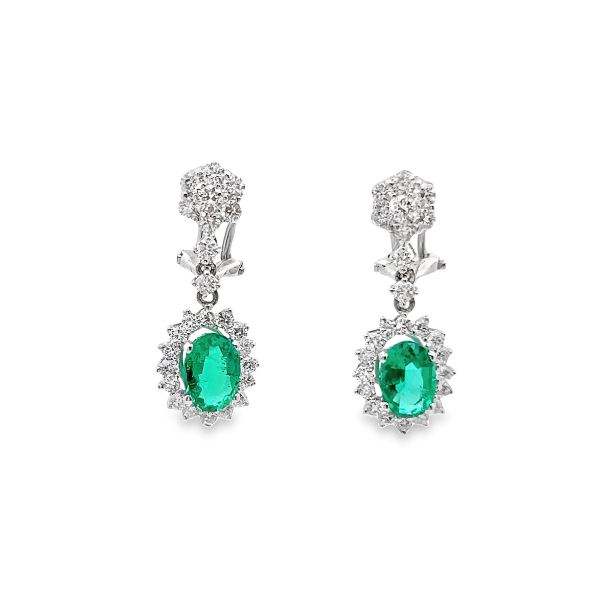 These timeless and feminine beauties feature oval cut emeralds are surrounded by sparkling diamond halos and set in high polished 18k white gold. These dangle earrings are secured with omega backs.