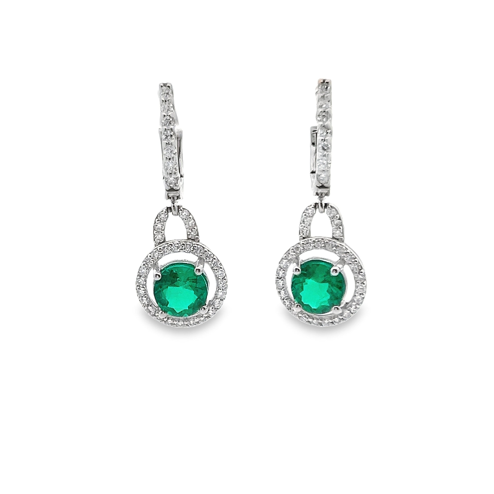 These timeless and feminine beauties feature round-cut emeralds and are surrounded by a sparkling diamond halo, set in high polished 14k white gold. These dangle earrings are secured with lever backs.