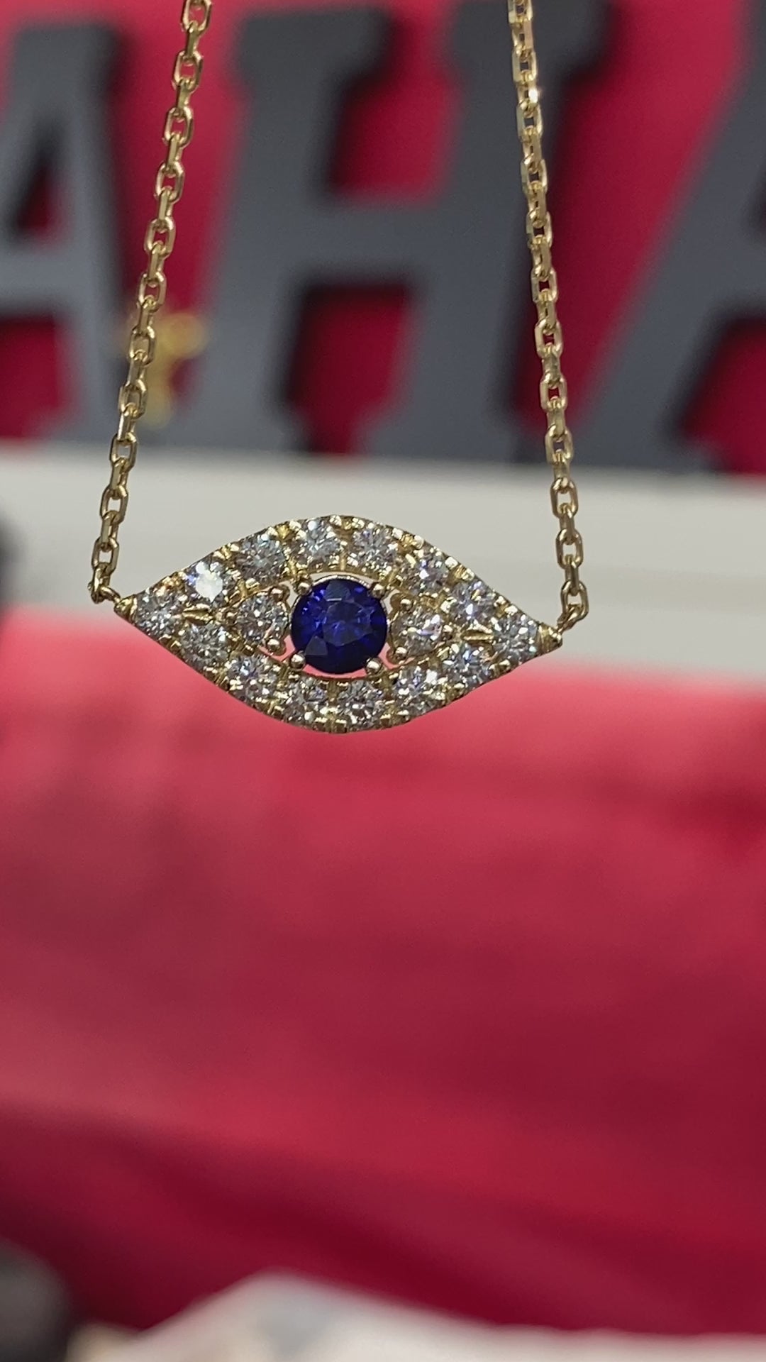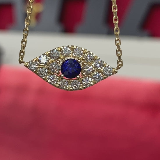 This elegant evil eye features a blue sapphire as the center stone surrounded by round-cut diamonds that reflect beautifully off the light. Wearing an evil eye represents a symbol of protection from misfortune and is believed to ward off evil and jealous eyes.