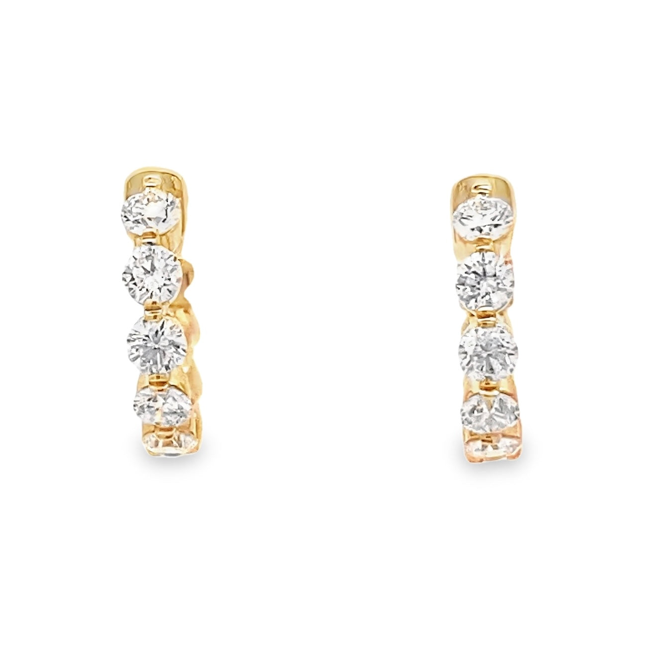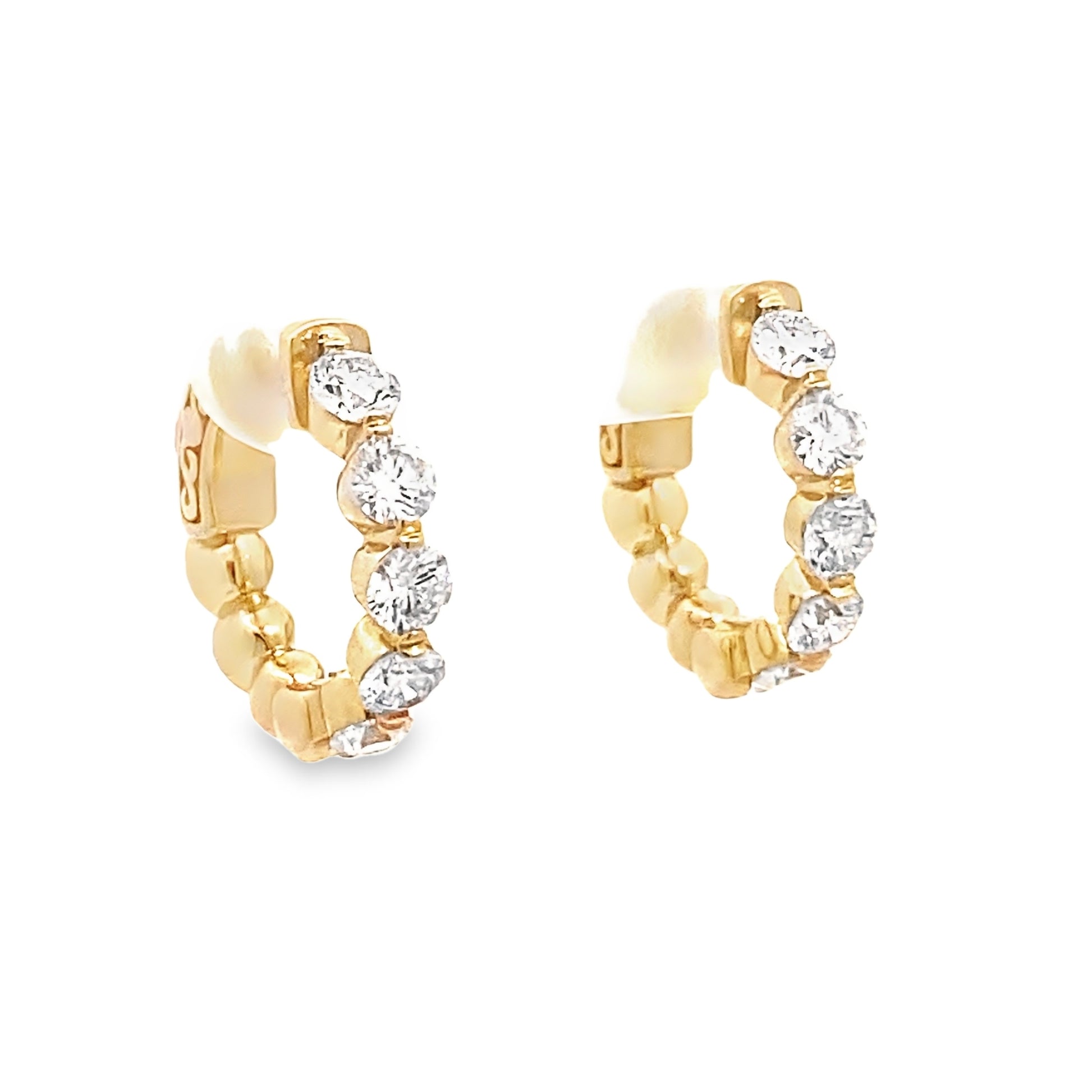 These elegant huggie hoop earrings offer subtle sparkle and essential style. Designed after the LKS diamond hoop earrings with slightly smaller diamonds for an every day look. The earrings feature floating round brilliant-cut diamonds, with light exposure of diamonds lining the front frame.