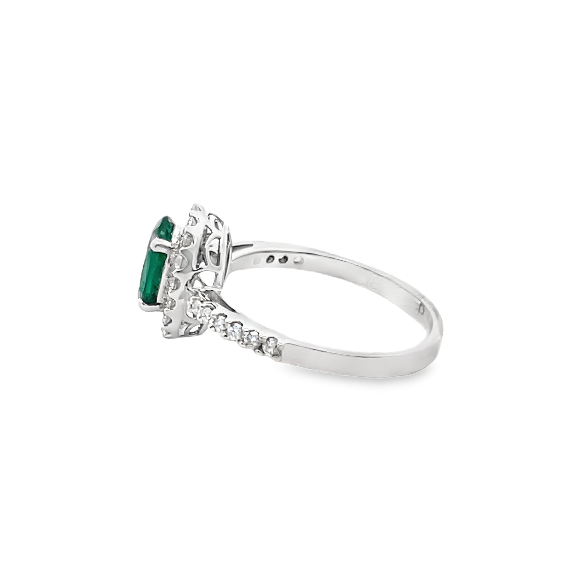 Green Emerald and Diamond Ring with Halo in 18K White Gold