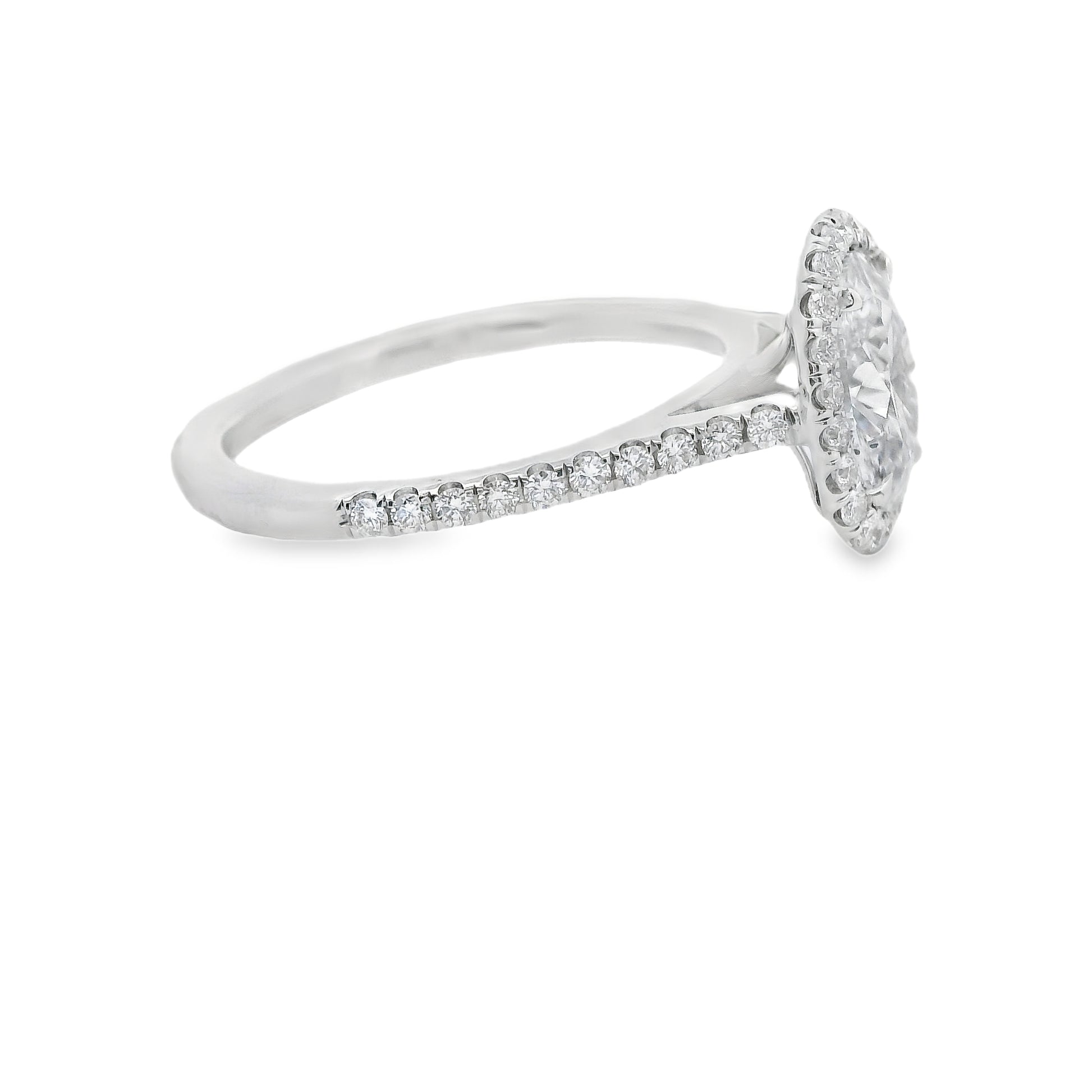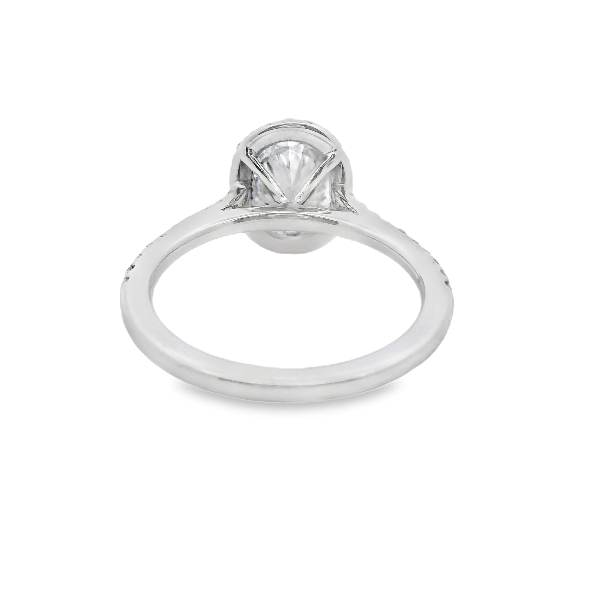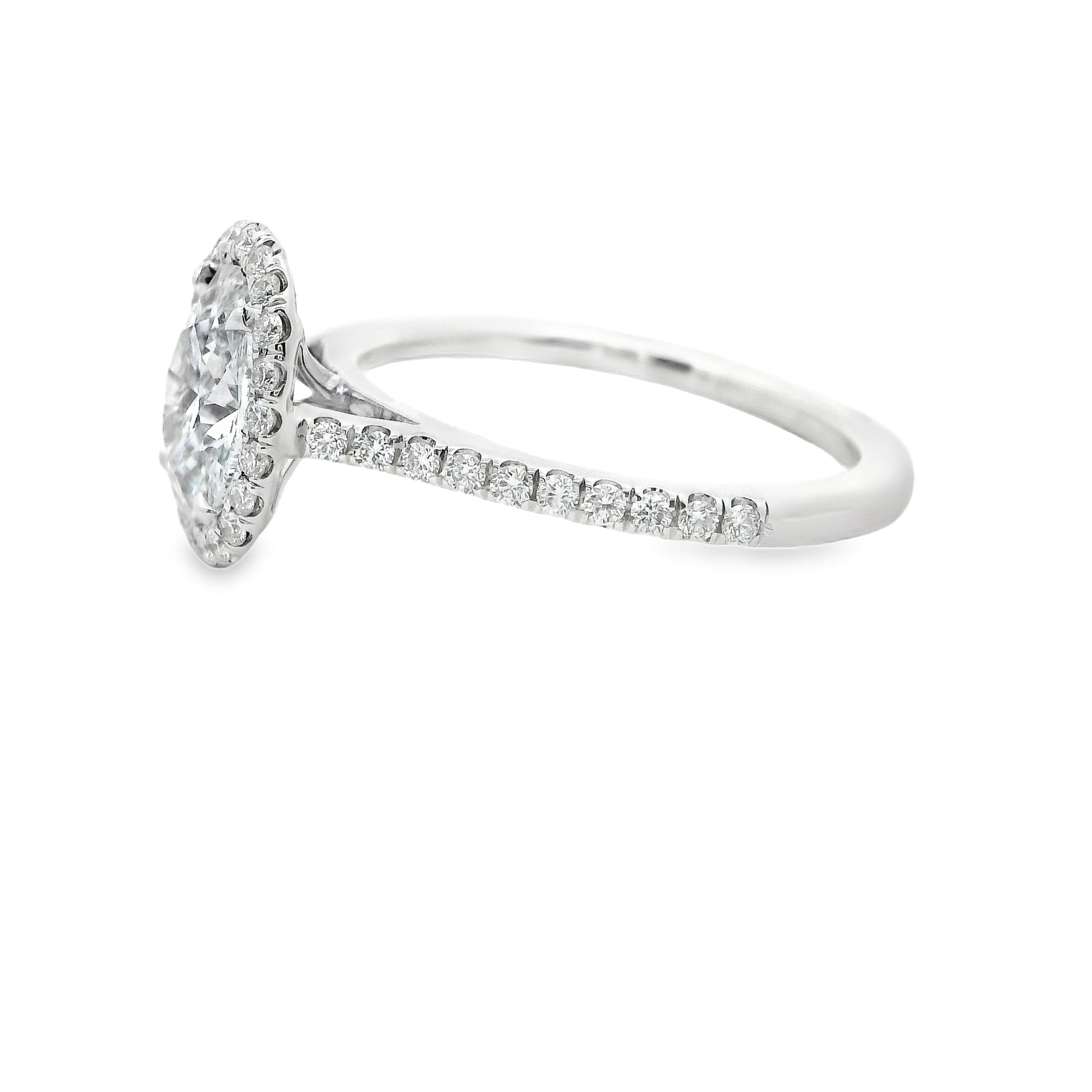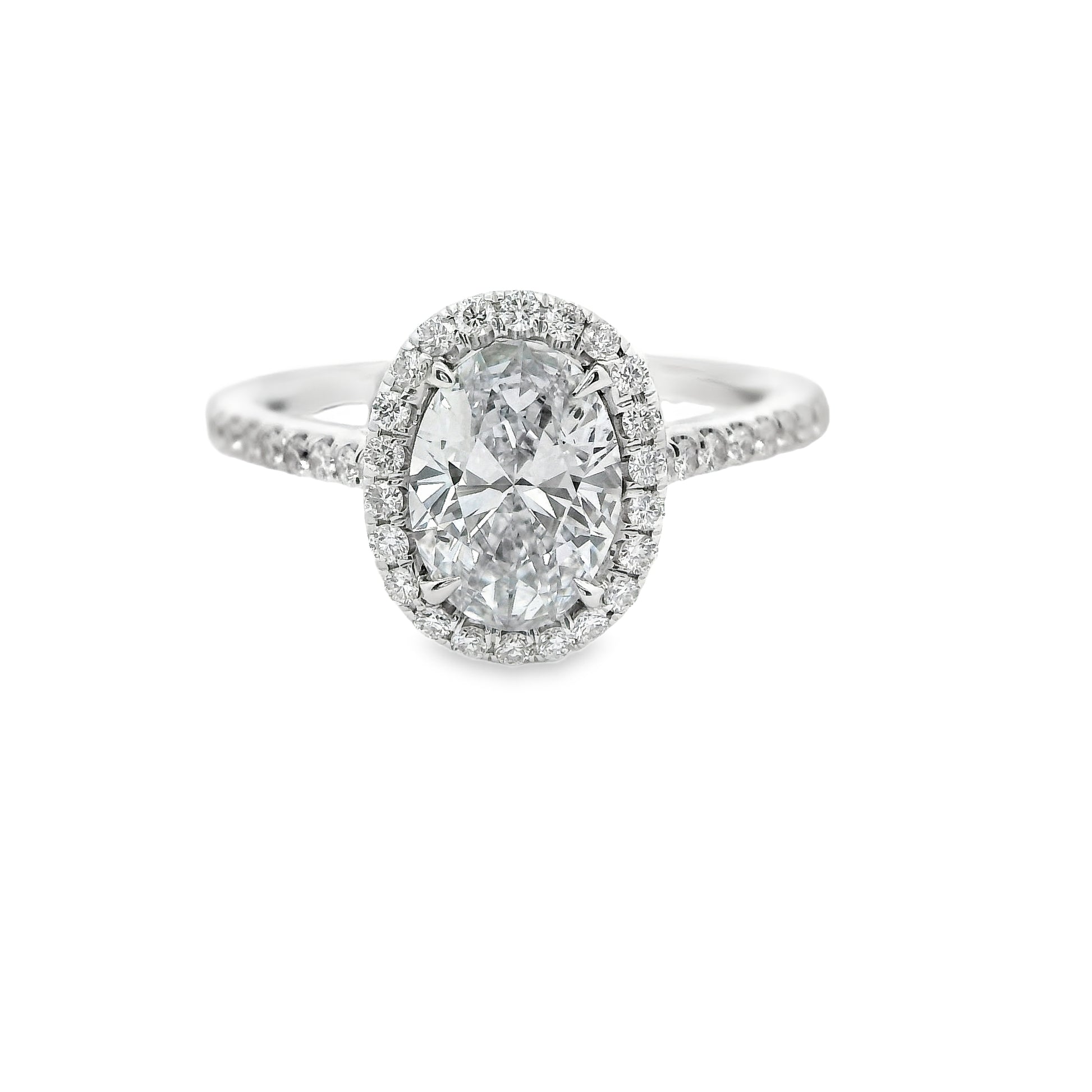 This exquisite engagement ring showcases a central oval-cut diamond surrounded by a sparkling round-cut halo, complemented by dazzling diamond details on the shoulders. An elegant style taken to new sparkling heights.