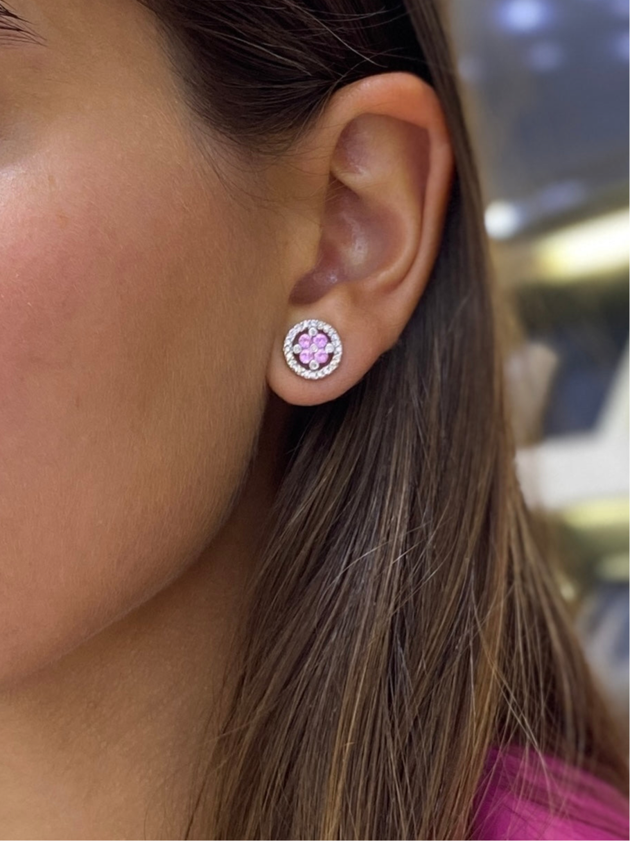 Timeless beauty gains a touch of color in these mesmerizing stud earrings, featuring pink sapphire gemstones, surrounded by halos of glistening round brilliant-cut diamonds set in 14k white gold. This chic pair of earrings will instantly upgrade your look