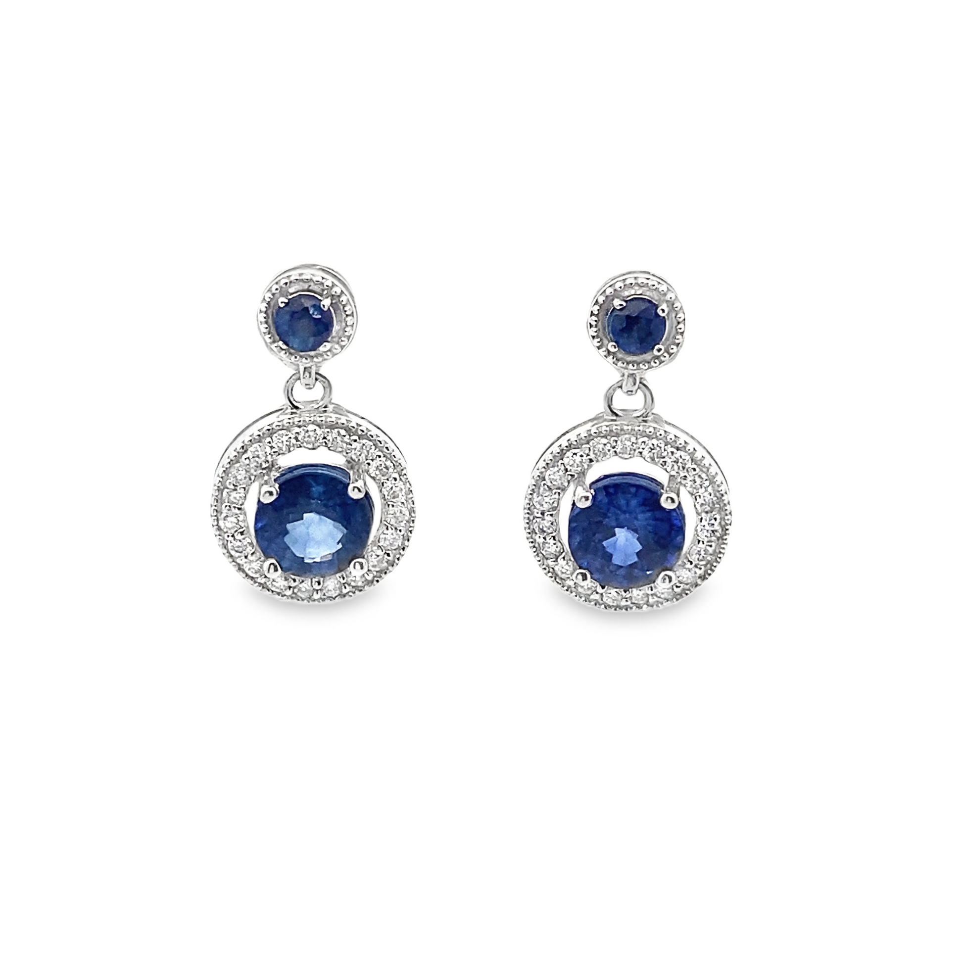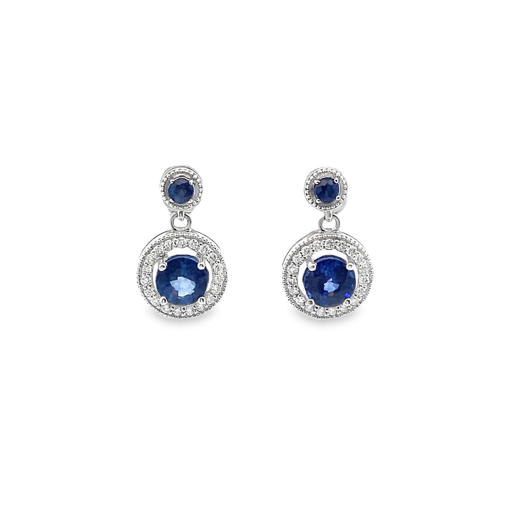 Timeless beauty gains a touch of color in these mesmerizing drop earrings, featuring richly hued deep blue Round-Cut Sapphire gemstones, surrounded by halos of round brilliant-cut diamonds set in 14k White Gold.
