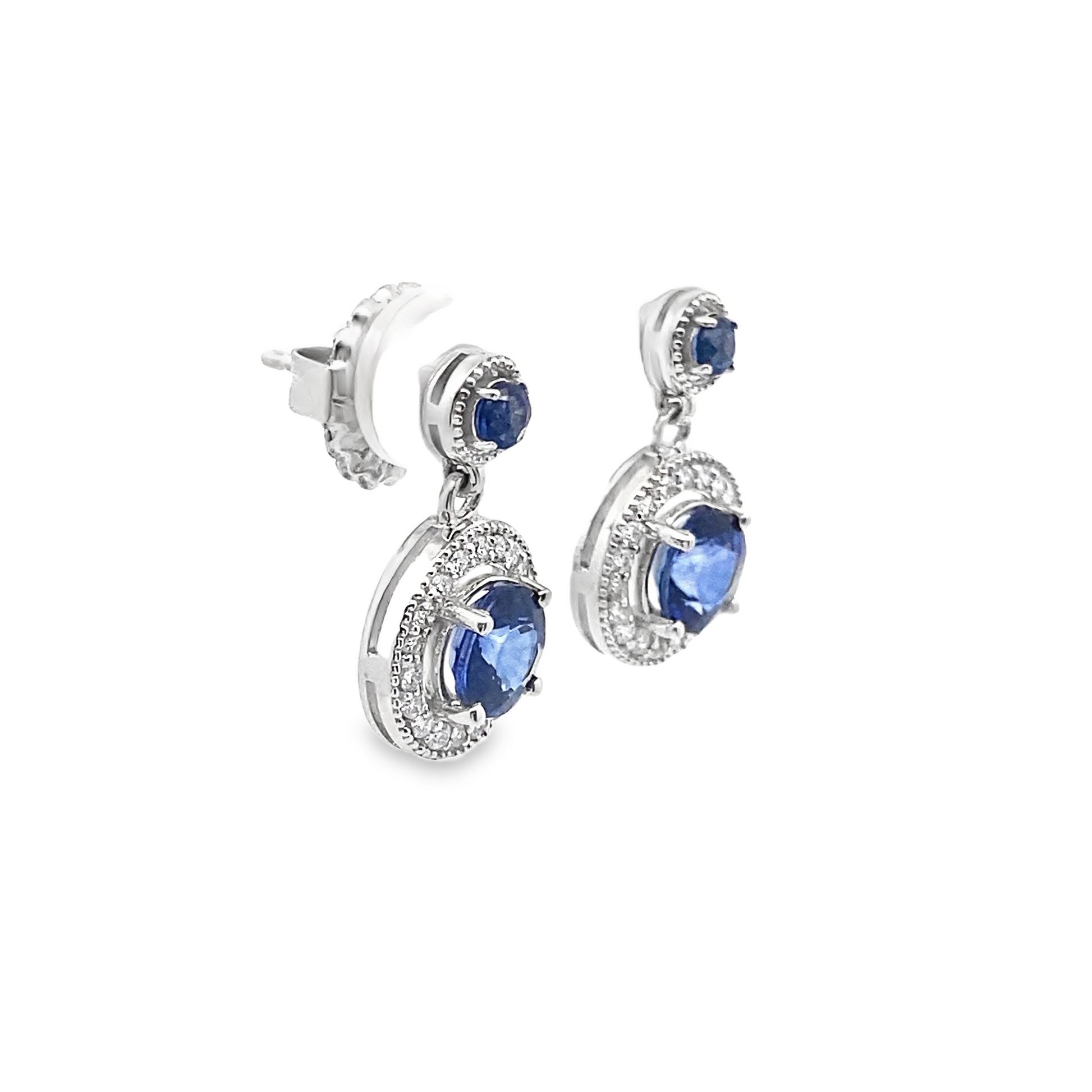 Halo Sapphire and Diamond Drop Earrings in 14K White Gold