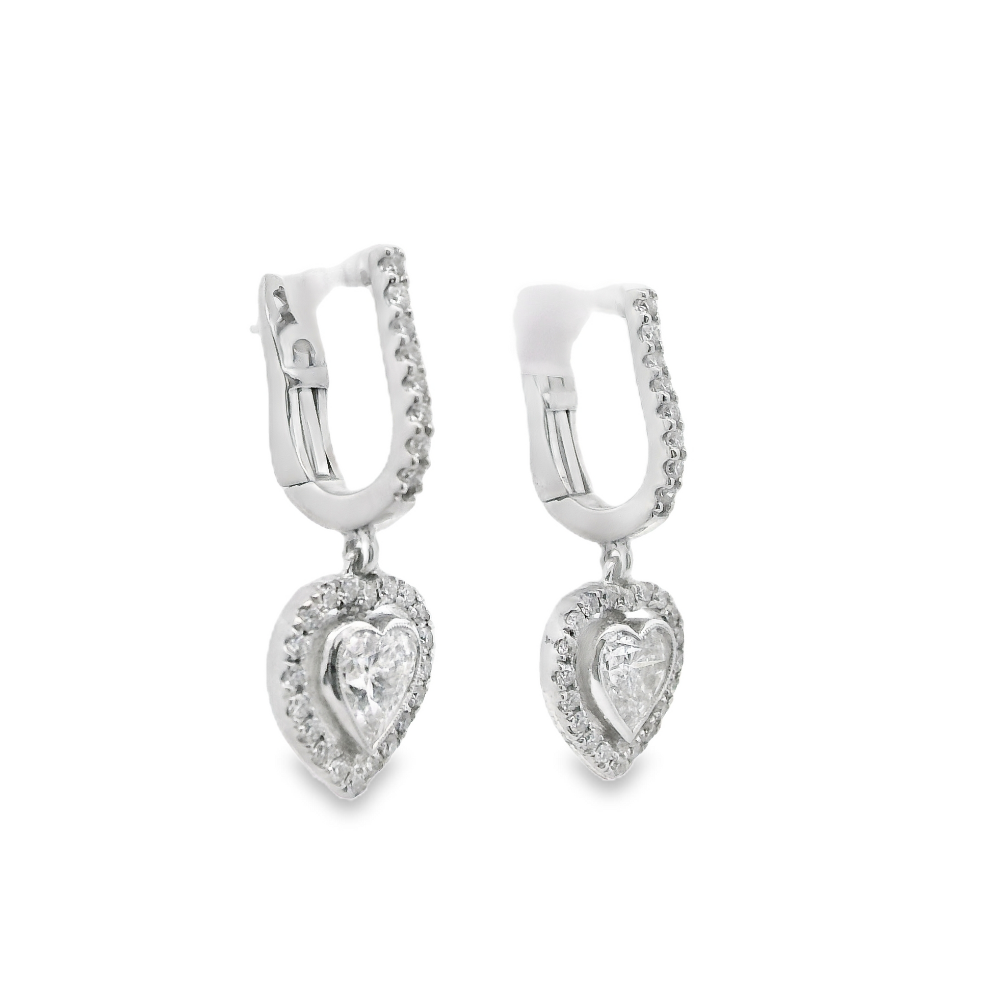 Heart-Shaped Diamonds take center stage in these elegant dangle earrings, each stone encircled by a luminous halo of smaller diamonds that amplify brilliance and create a sophisticated frame. The suspended design allows light to dance through the stones from every angle, making these pieces ideal for both everyday elegance and special occasions. Crafted with precision, the halo setting enhances the visual impact of the center diamond while adding depth and dimension to your look.