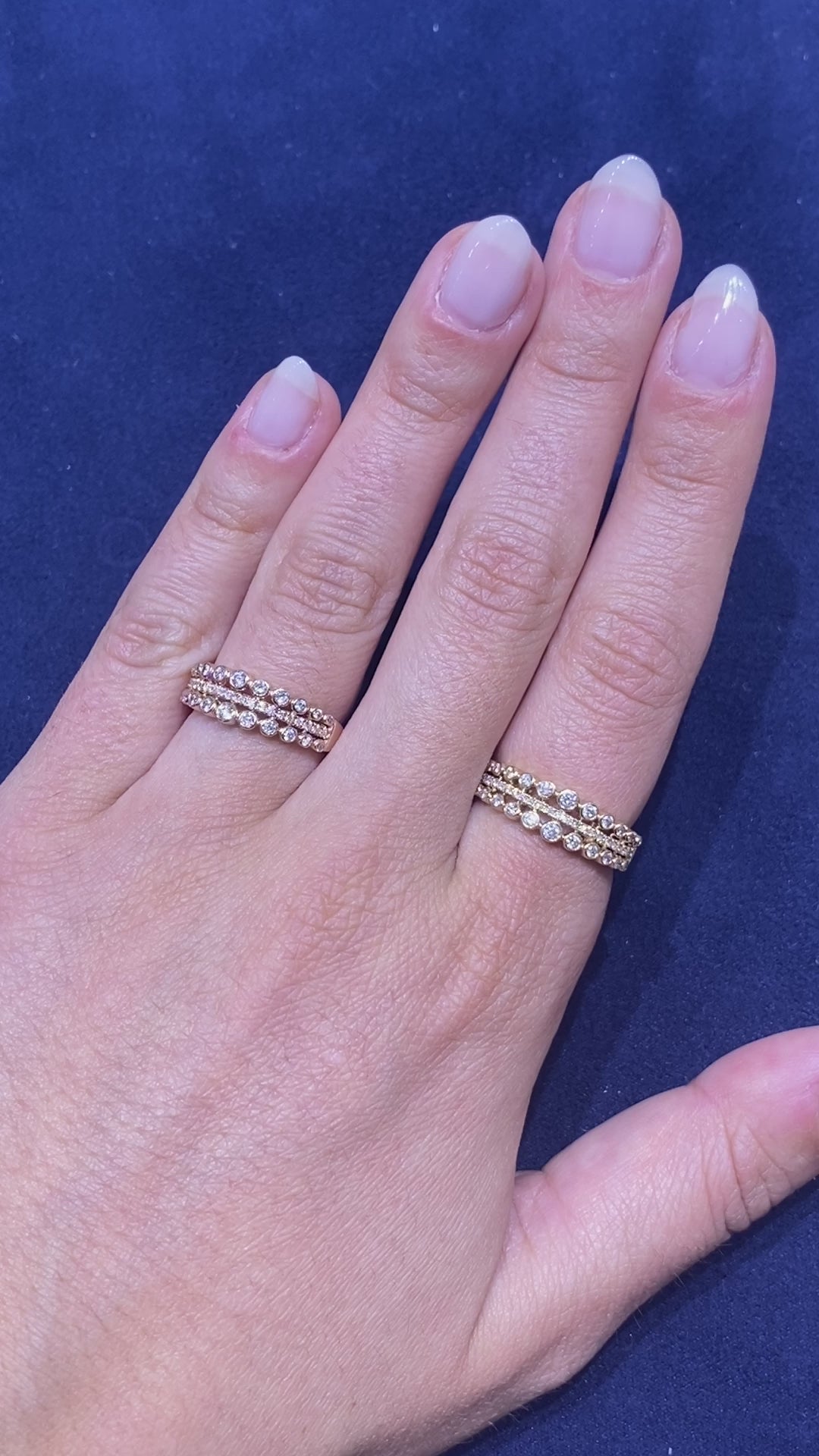 This elegant three row ring features sparkling bezel-set diamonds on a band of 14K rose gold. The unique design adds a touch of sophistication and luxury to any outfit. Treat yourself or a loved one to this stunning piece of jewelry.