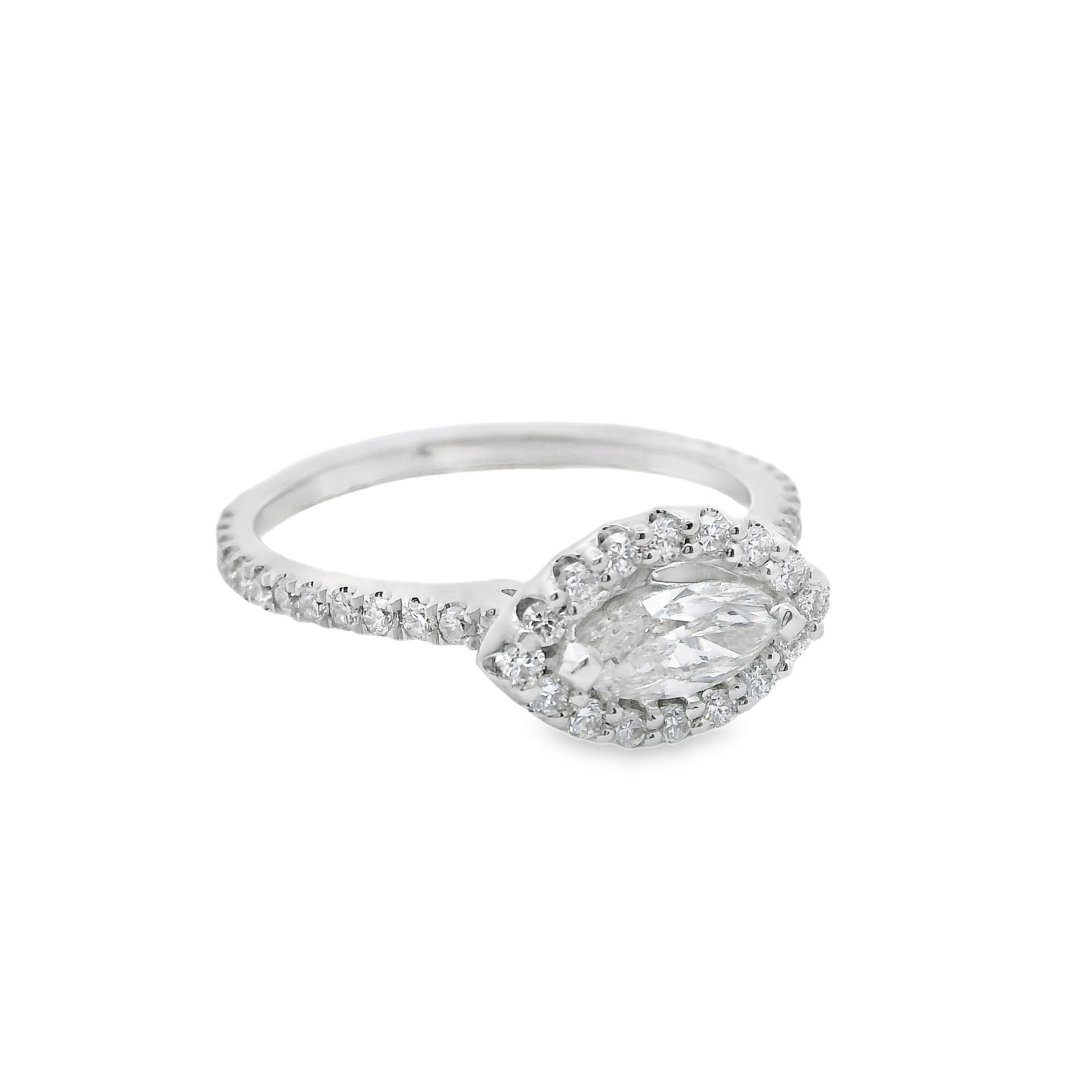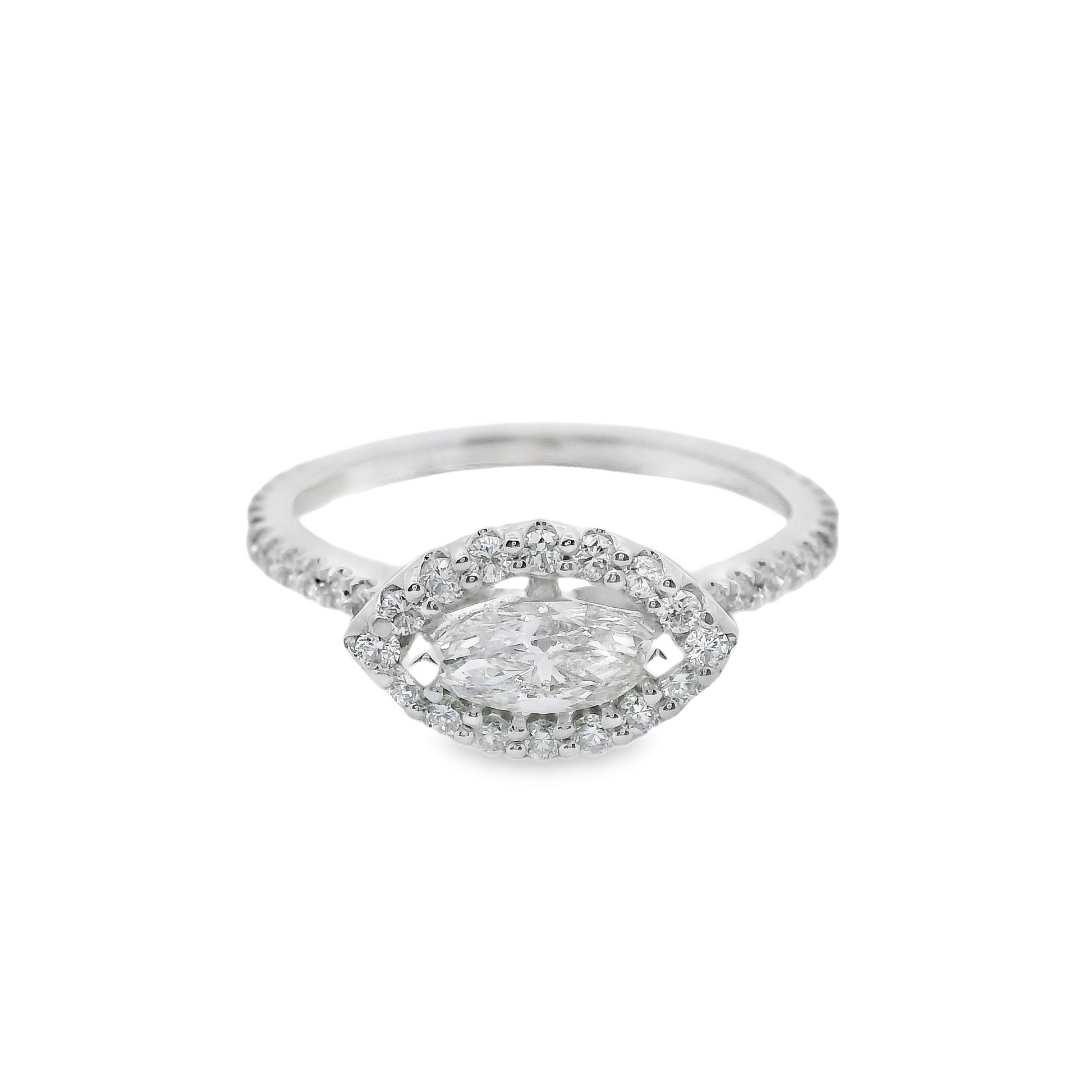 This charming Marquise Cut engagement ring sparkles with a single row of tiny round brilliant micro-pavé diamonds, all nestled within a unique marquise-shaped halo that beautifully highlights the marquise-cut center stone.
