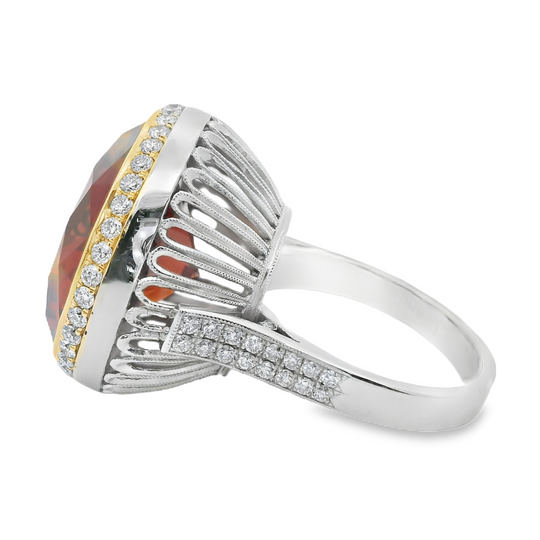 This Orange Citrine ring is a stunning statement piece featuring an impressive diamond halo in a platinum setting. The orange citrine complements the diamond beautifully, creating a striking contrast between vivid color and sparkle. The unique orange hue of the Citrine combined with the rich and timeless gleam of platinum makes this exclusive ring a one-of-a-kind piece of jewelry.