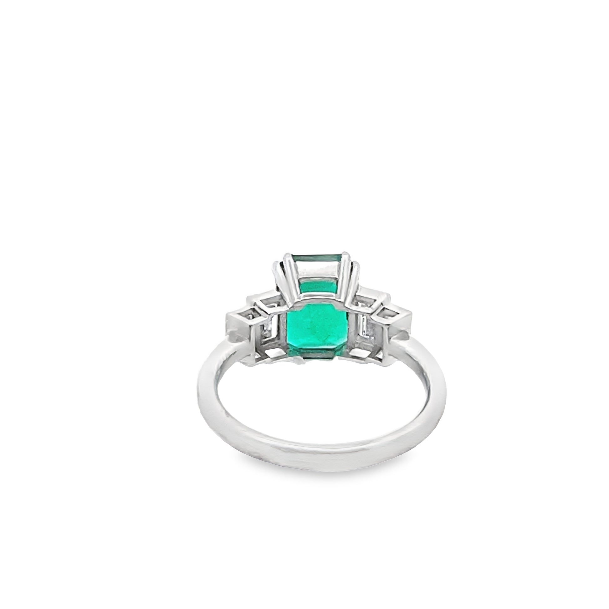 This beautiful emerald stone in four prong setting mesmerizes with its lovely green hue. Brilliant emerald-cut diamonds on each side of the emerald stone., accent the center stone