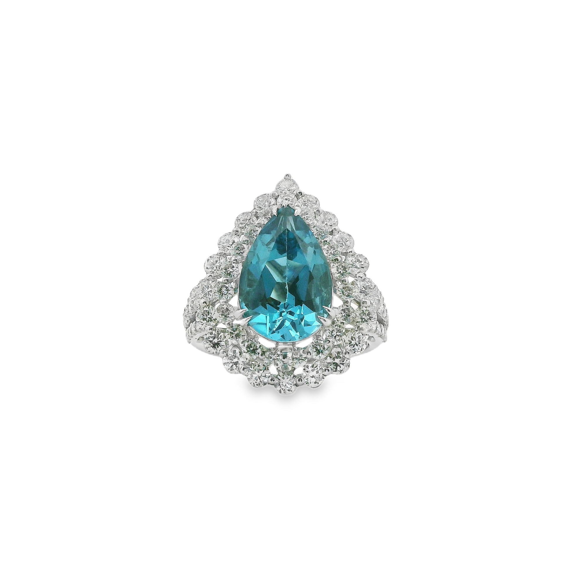 Elegant pear-cut blue topaz takes center stage in this sophisticated ring, surrounded by a sparkling diamond halo that amplifies its brilliance. The precise geometric faceting of the pear shape creates dynamic light play, while the cluster of diamonds frames the stone with timeless refinement. Ideal for those seeking a distinctive engagement ring or statement piece that balances bold color with classic elegance.
